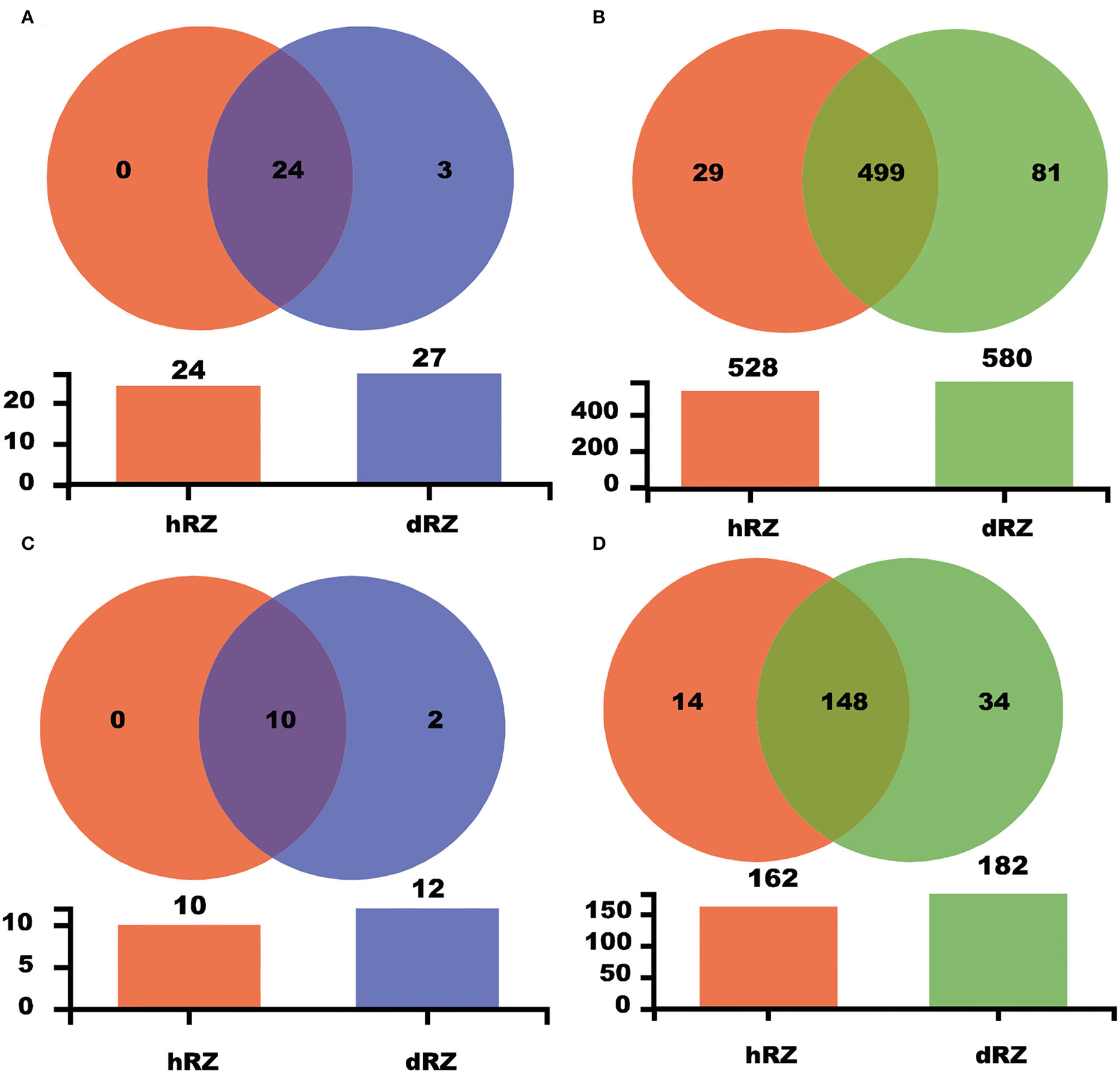 Common and unique taxonomic groups in two soil samples were visualized with a Venn diagram. At the phylum level, 24 prokaryotic phyla, namely, Proteobacteria, Diapherotrites, Actinobacteria, FCPU426, Firmicutes, Latescibacteria, Nitrospirae, Dependentiae, Acidobacteria, Planctomycetes, Euryarchaeota, Thaumarchaeota, Cyanobacteria, Armatimonadetes, Spirochaetes, Bacteroidetes, WPS-2, Gemmatimonadetes, Elusimicrobia, Verrucomicrobia, Chloroflexi, Rokubacteria, Patescibacteria, and unclassified_k__norank_d__Bacteria that were contained in both hRZ and dRZ; Epsilonbacteraeota, WS2, and Zixibacteria, were the prokaryotic phyla that were contained only in dRZ (Figure 3A and Supplementary Figure 2). Ten fungal phyla, namely, Mortierellomycota, Chytridiomycota, Ascomycota, Mucoromycota, Monoblepharomycota, Basidiomycota, Rozellomycota, Olpidiomycota, Kickxellomycota, and unclassified_k__Fungi, were contained in both hRZ and dRZ. Zoopagomycota and Fungi_phy_Incertae_sedis were the fungal phyla that were contained only in dRZ (Figures 2C, 3C and Supplementary Figure 3). At the genus level, 499 prokaryotic genera were contained in both hRZ and dRZ and 29 and 81 prokaryotic genera were contained only in hRZ and dRZ, respectively (Figure 3B and Supplementary Figure 4). One hundred and forty-eight fungal genera were contained in both hRZ and dRZ, and 14 and 34 fungal genera were contained only in hRZ and dRZ, respectively (Figure 3D and Supplementary Figure 5).