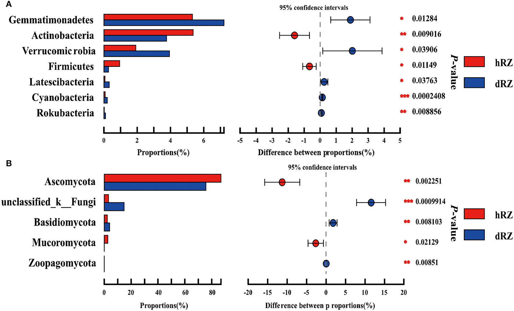 Figure 4. Relative abundances of prokaryotic (A) and fungal (B) phyla show significant differences between healthy and diseased rhizosphere soils. *Indicates significantly different values, *0.01 < P ≤ 0.05, **0.001 < P ≤ 0.01, ***P ≤ 0.001. P-values are based on Student's t-tests. hRZ, healthy rhizosphere soils; dRZ, diseased rhizosphere soils (n = 3).