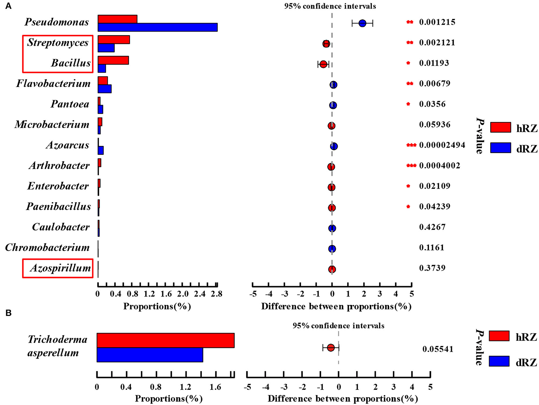 Figure 6. Relative abundances of beneficial bacterial genera (A) and fungal species Trichoderma asperellum (B) both in healthy and diseased rhizosphere soils. *Indicates significantly different values, *0.01 < P ≤ 0.05, **0.001 < P ≤ 0.01, ***P ≤ 0.001. P-values are based on Student's t-tests. The red box indicates the antagonistic bacteria species used in strawberries. hRZ, healthy rhizosphere soils; dRZ, diseased rhizosphere soils (n = 3).