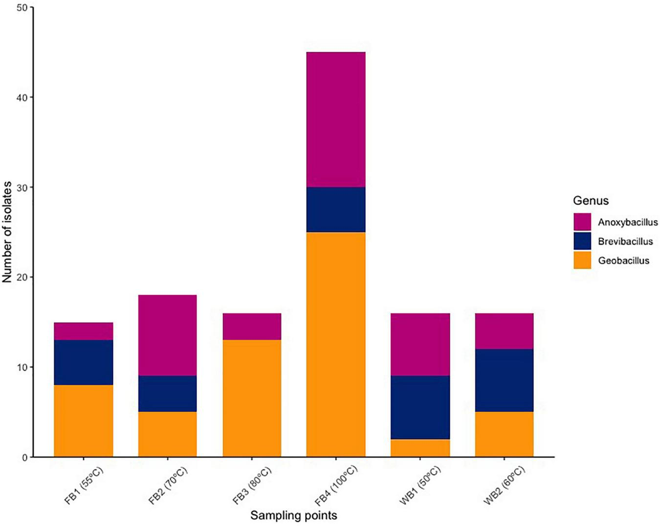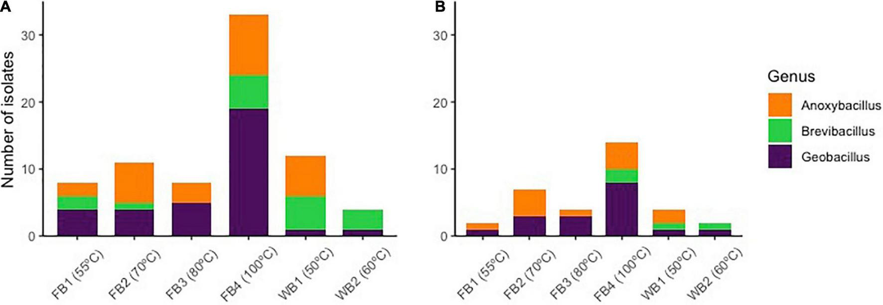 Firmicutes was the only bacterial phylum with which the sequences of the 16S rRNA gene of 126 isolates were affiliated. Most isolates were assigned to Geobacillus (46%, 58 isolates), followed by Anoxybacillus (31.8%, 39 isolates), Brevibacillus (22.2%, 28 isolates). Geobacillus-related isolates were found at every collection site and predominated in the fumaroles above 80°C. However, Brevibacillus was not isolated from FB3 (80°C), but was prominent in samples from Whalers Bay (WB1 and WB2) (Figure 1 and Supplementary Table 2).