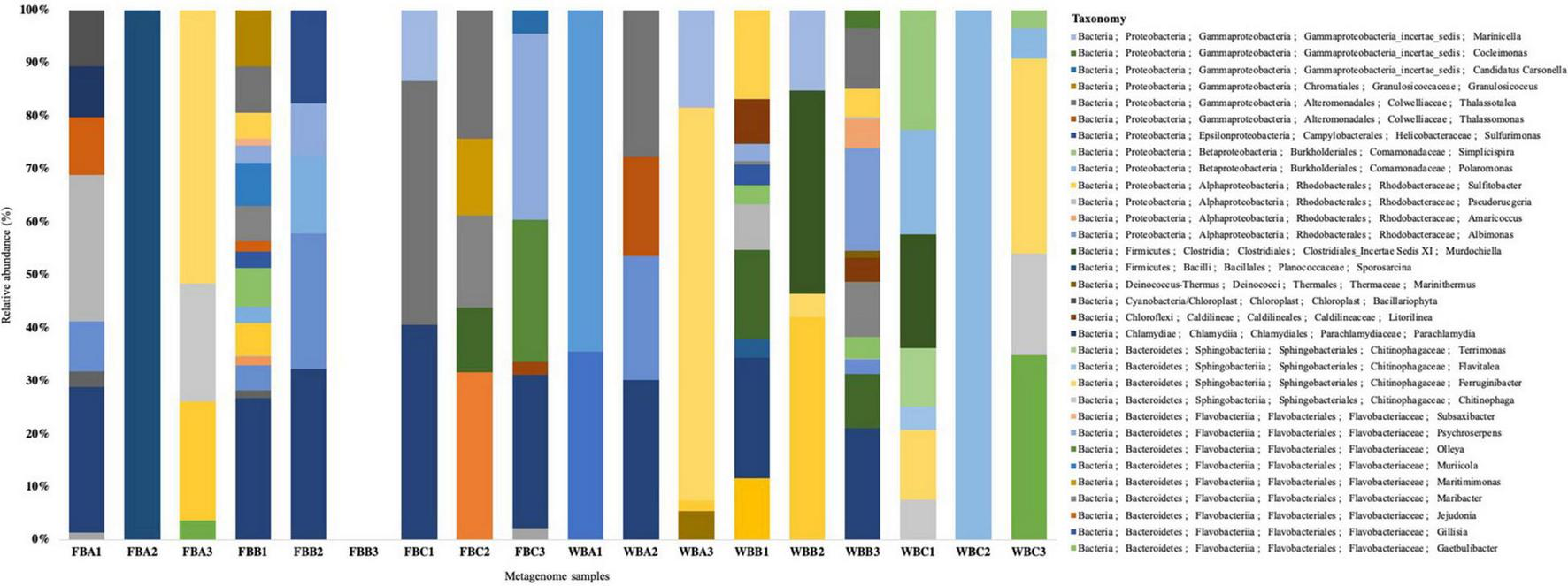 The DNA used to perform the metagenomic sequencing was extracted from samples collected in the same area where the samples for isolating bacteria were obtained. The DNA extraction and metagenome sequencing (Shotgun) methods were described by Bendia et al. (2021). Reads were filtered using SICKLE software (Joshi and Fass, 2011), using a minimum Phred score of 30. Metagenomics RAST server (MG-RAST) provides sequence quality control by removing duplicate sequences and selecting sequences larger than 80 bp and a Phred score greater than 30 for analysis (Meyer et al., 2008). All the metagenomic sequences were retrieved from the MG-RAST server (project ID mgp15628).