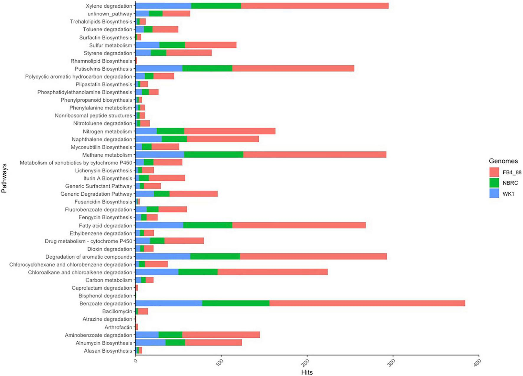 The predicted contigs were analyzed with GO FEAT (Araujo et al., 2018), an on-line platform for functional annotation and enrichment of genomic data integrated with the UNIPROT,2 INTERPRO,3 PFAM,4 NCBI,5 and KEGG6 databases. Functional annotations were performed using Rapid Annotation of microbial genomes, using Subsystems Technology (RAST) (Aziz et al., 2008), and the results were used to infer functions at subsystem levels. BioSurfDB, an online server with a specific database for biodegradation, was used to predict genes related to hydrocarbon degradation and biosurfactant production. To predict biosynthetic gene clusters (BGCs) and bacteriocins, the web-based platforms antiSMASH 5.0 (Blin et al., 2021) and BAGEL 4.0 (van Heel et al., 2018) were used. Prophage sequences were identified using Phage Search Tool Enhanced Release (PHASTER) (Arndt et al., 2016).