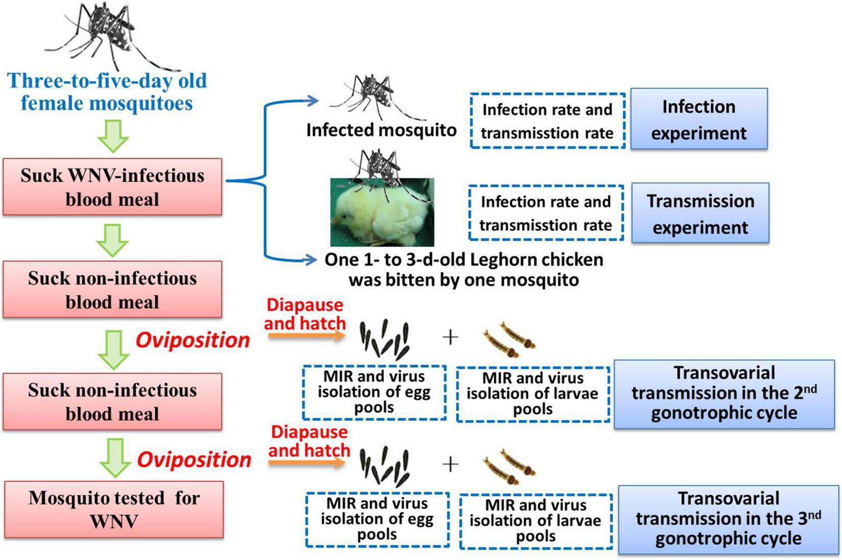Aedes Albopictus egg undergoes facultative diapause as the mechanism for surviving unfavorable environments, such as winter or arid and frigid environments (Hong et al., 1971). Therefore, the egg diapause mechanism may contribute to arbovirus preservation. A previous study has confirmed that the Japanese encephalitis virus can survive in dried infected Ae. Albopictus eggs for 2 months (Rosen et al., 1978). Additionally, dengue virus 2 was detected in diapause eggs of Ae. Albopictus (Guo et al., 2007) and transmitted to progeny after diapause termination (Guo et al., 2004). Diapausing behavior may provide an important mechanism for the maintenance of arbovirus under adverse climatic conditions. This work is aimed to confirm the possibility of WNV surviving in the cold season and playing a possible role in an endemic cycle in the next year.