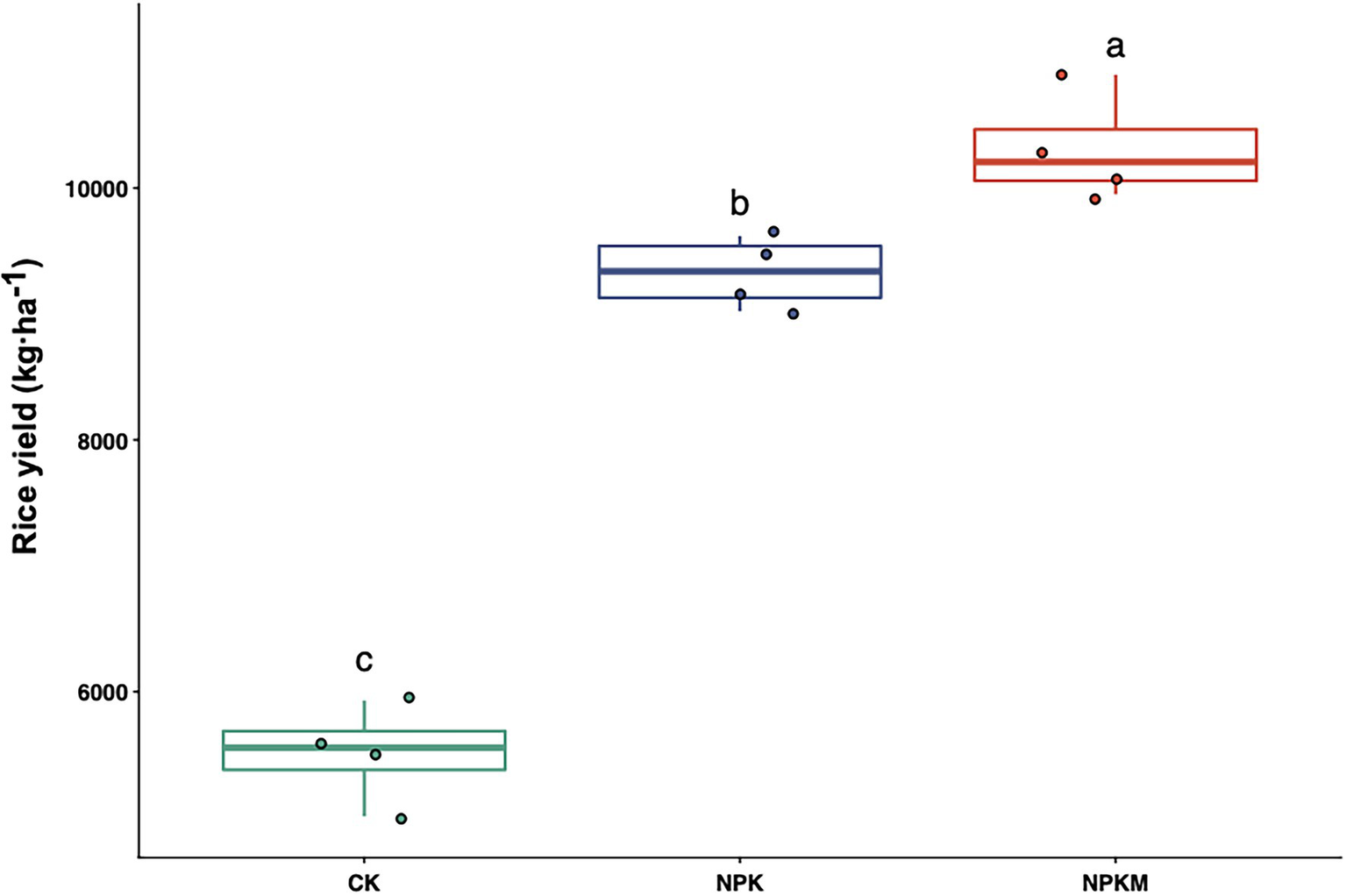Effects of long-term fertilization treatments on rice yield. Different letters indicate significant differences among treatments (Tukey’s post hoc test, p < 0.05).