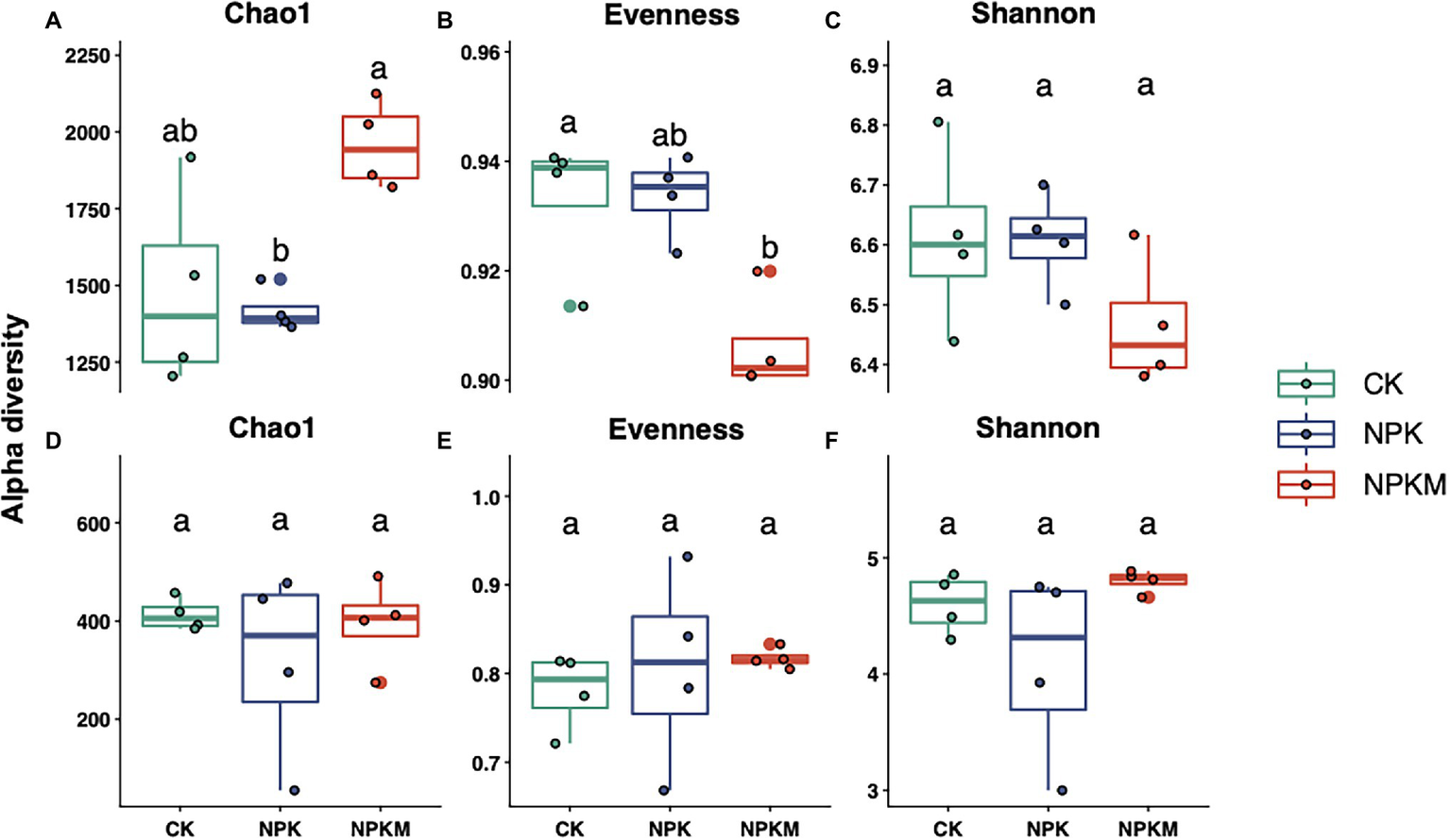 Effects of long-term fertilization treatments on Chao1 richness, evenness, and Shannon diversity indices of (A–C) bacteria and (D–F) fungi. Different letters indicate significant differences among treatments (Tukey’s post hoc test, p < 0.05).