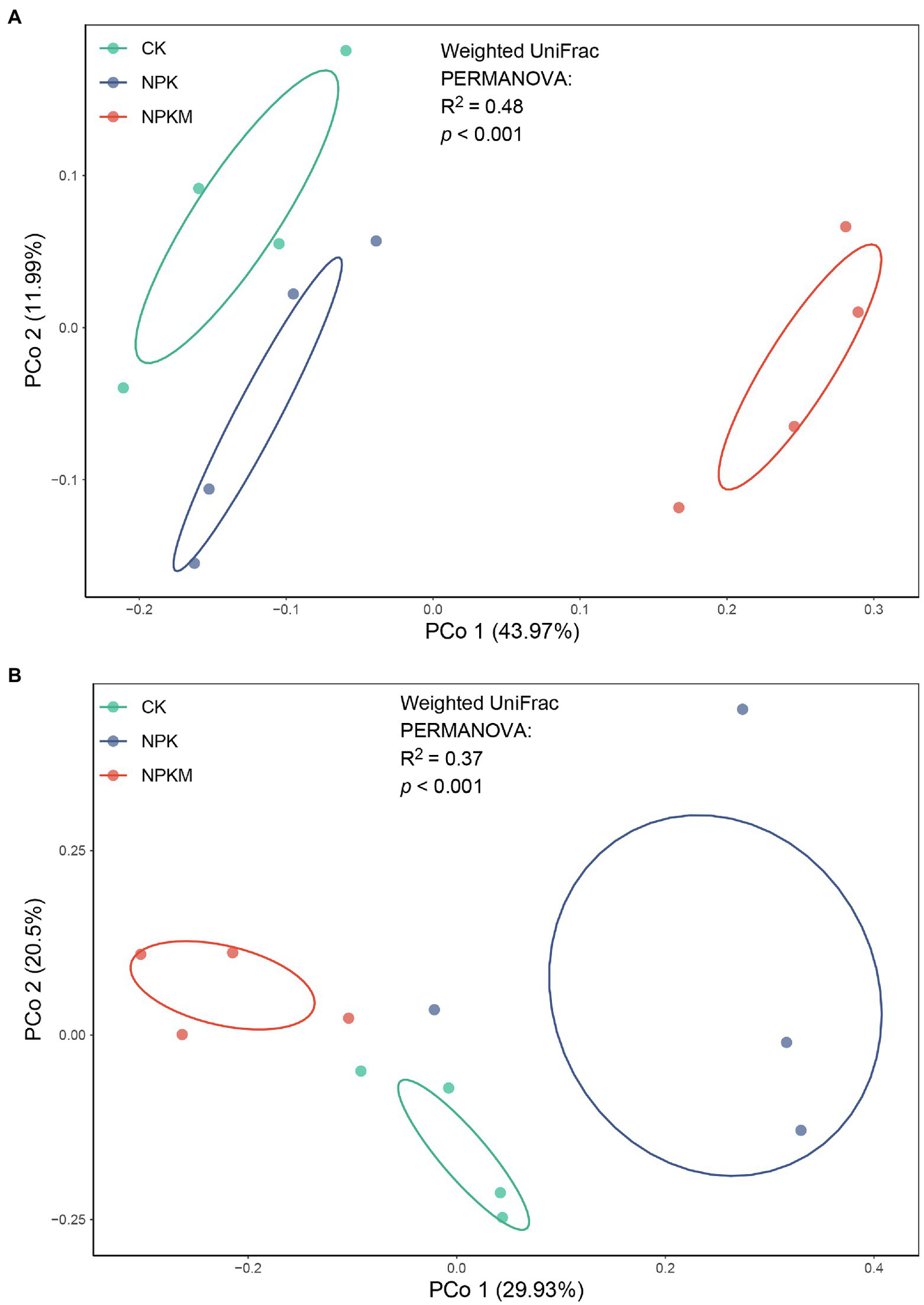 Unconstrained principal coordinate analysis (PCoA) with weighted UniFrac distance showing effects of long-term fertilization treatments on beta-diversity of soil (A) bacterial and (B) fungal communities.