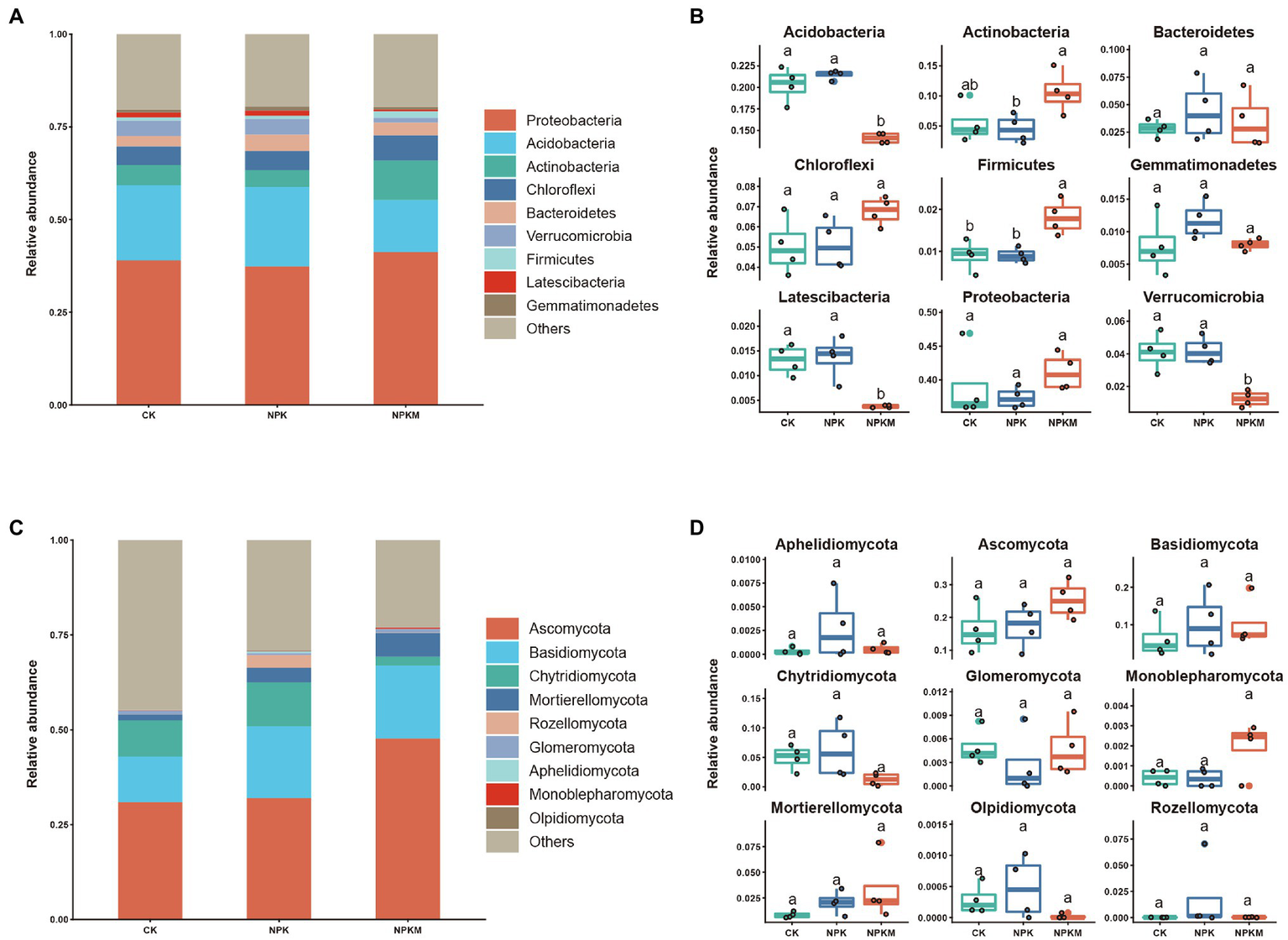 Effects of long-term fertilization treatments on composition of bacterial and fungal communities. Phylum-level composition of (A) bacterial and (C) fungal communities. Analysis of differences in relative abundances of (B) bacterial phyla in A and (D) fungal phyla in C. Names of the nine most abundant phyla are shown, and other phyla were grouped as “Others.” Different letters indicate significant differences (Tukey’s post hoc test, p < 0.05).