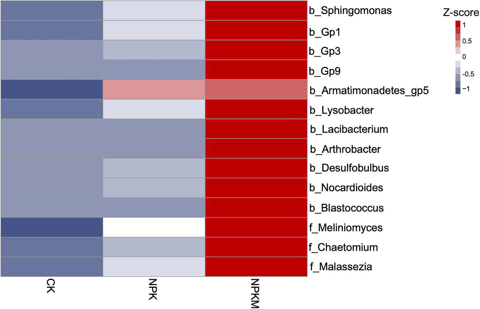 Heat map of relative abundances of genera of bacteria and fungi with positive correlations to rice yield. Relative abundances were Z-score normalized. Genus-level bacteria names begin with “b”, and genus-level fungi names begin with “f”.