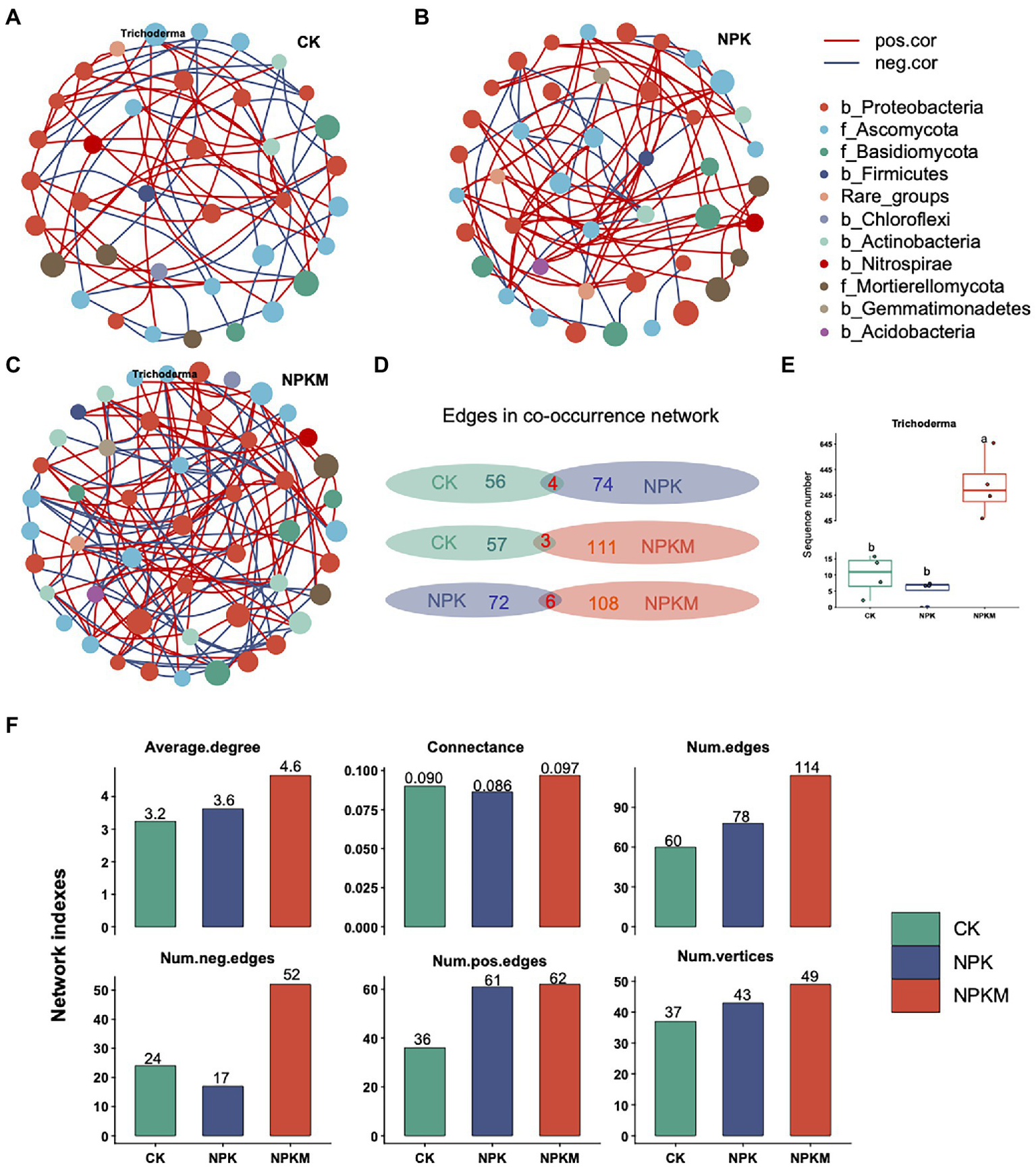 Co-occurrence networks of bacterial and fungal communities in (A) control (CK), (B) nitrogen–phosphorus–potassium (NPK), and (C), NPK plus organic fertilizer (NPKM) fertilization treatments. Each node in a network represents a genus of bacteria or fungi. Size of a node represents average relative abundance of a genus of bacteria or fungi. Different colors of nodes provide taxonomic information at the phylum-level. In the legend, names of bacterial phyla begin with “b,” and names of fungal phyla begin with “f.” (D) Common and unique edges in co-occurrence networks between each two of the three treatments. (E) Comparison of sequence numbers of the fungus Trichoderma in different fertilization treatments. (F) Indices related to topological structure of the co-occurrence interaction network of bacterial–fungal communities.