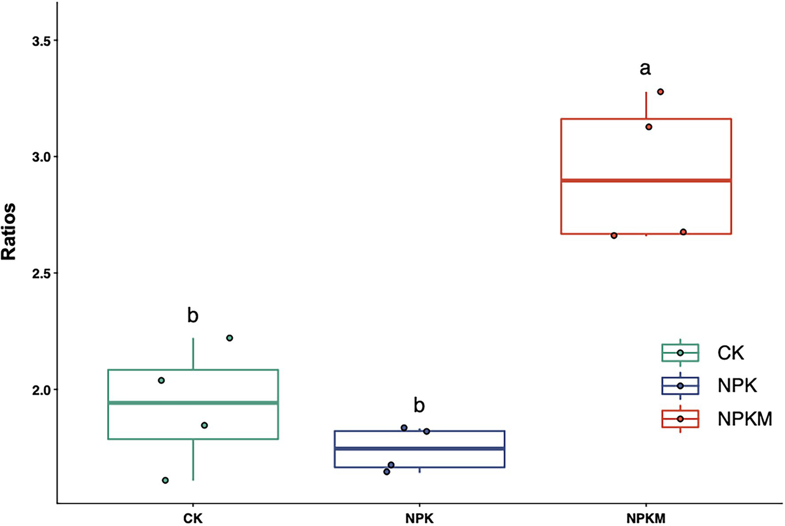 Effects of long-term fertilization treatments on the ratio of Proteobacteria to Acidobacteria. Different letters indicate significant differences (Tukey’s post hoc test, p < 0.05).