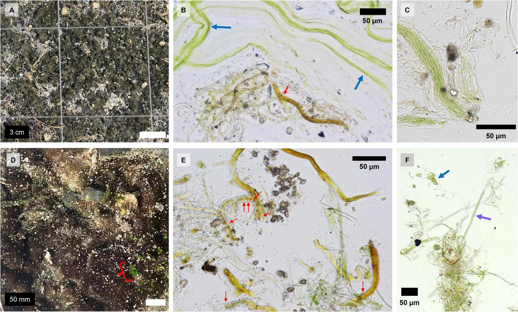 Figure 1. Images and micrographs of Grape and Citrus biocrusts: (A) Grape biocrust close-up, (B) filamentous algae bundles next to a heterocystous cyanobacterial filament in Grape, (C) non-heterocystous cyanobacterial bundles in Grape, (D) Citrus biocrust close-up with moss pointed out with a red bracket, (E) heterocystous filamentous cyanobacteria in Citrus, and (F) non-heterocystous cyanobacterial filament and unicellular algae in Citrus. Red arrows point to heterocystous cells, the blue arrow points to a group of unicellular algae, and the purple arrow points to a non-heterocystous cyanobacterial filament.