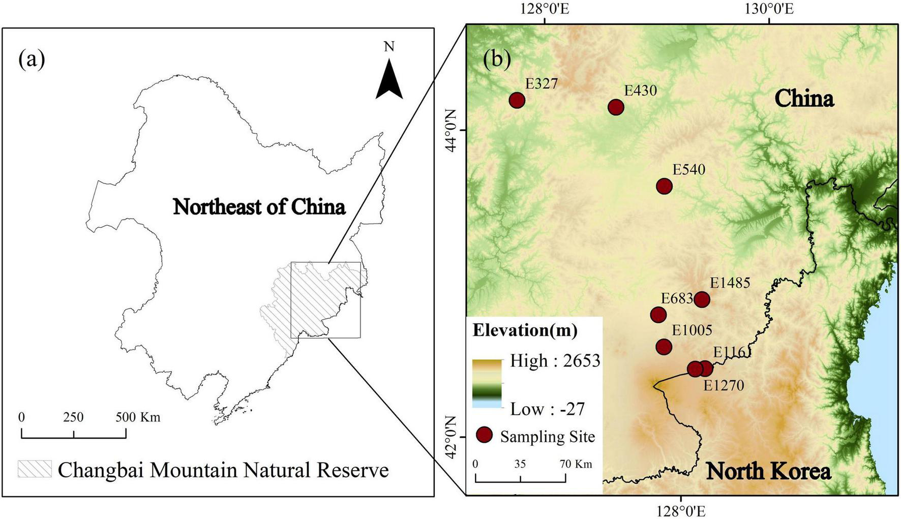 We collected samples on the north slope of the Changbai Mountain (41°41′49″– 42°25′18″ N, 127°42′55″–128°16′48″ E). Changbai Mountain is located in the northeast of China and is adjacent to the border between China and North Korea. Changbai Mountain is the highest mountain on the eastern edge of Eurasia, and it is vulnerable to climate change (Wang et al., 2021; Zhao et al., 2021). The peatlands are widely distributed in the Changbai Mountains with an altitude of about 300 to 1,500 m. The total area of peatlands in this region is about 23,100 ha, of which 70% are sedge peatlands dominated by Carex species (Bao et al., 2010; Wang et al., 2017). This area belongs to a temperate continental monsoon climate, which is characterized by long, cold winters and short, cool summers. The average annual temperature (MAT) from 327 to 1,485 m in our study ranges from –0.175 to 3.3°C, and the annual precipitation (MAP) is between 605 and 766 mm.