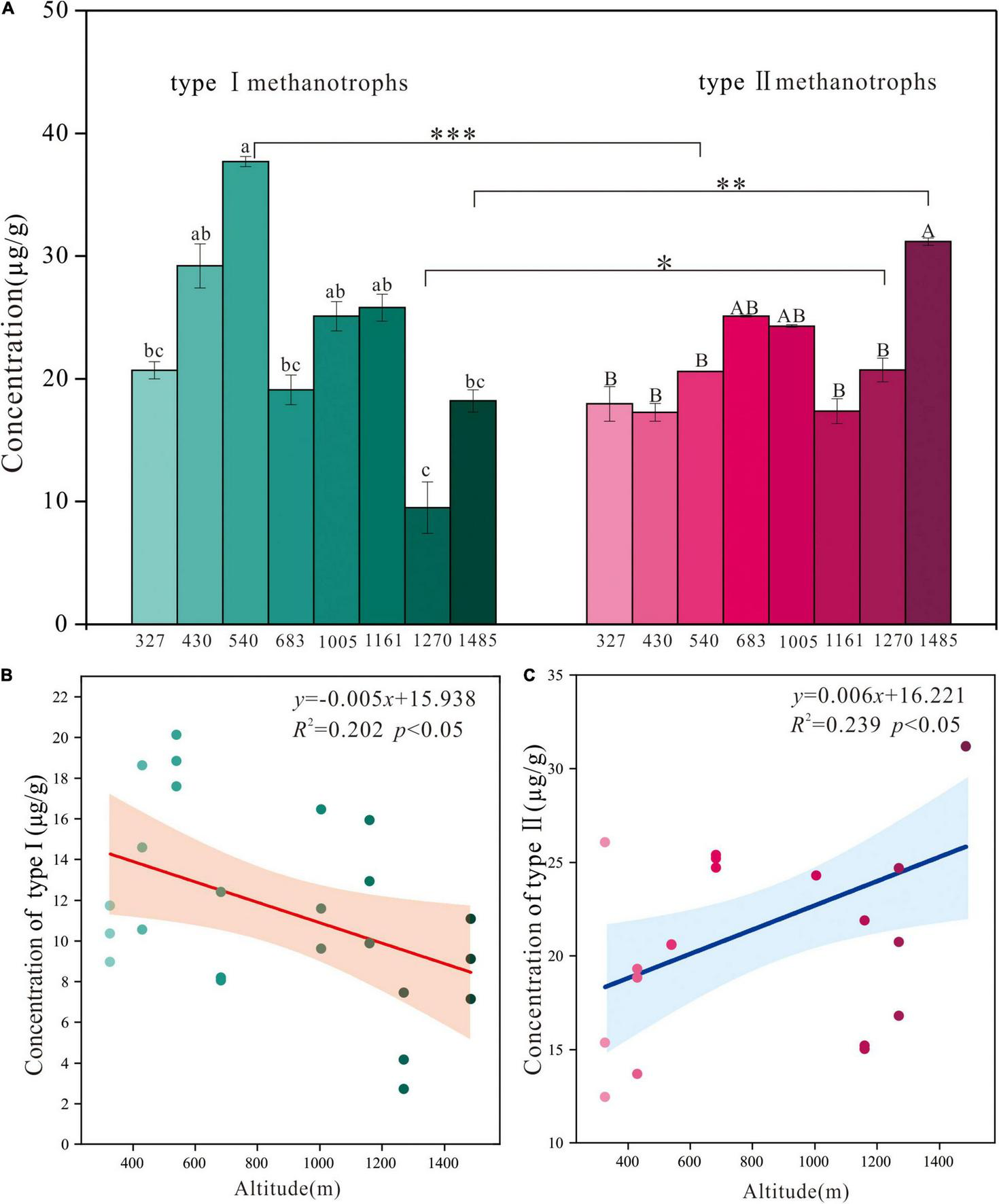 (A) The concentrations of type I and type II methanotroph biomarkers along the altitude gradient on the northern slope of the Changbai Mountain, China. Values were presented as means ± S.E. (n = 3). Different letters indicate significant differences among study sites based on one-way ANOVA and Tukey’s test (p < 0.05). The asterisk represents the difference between type I and type II methanotrophs at the same site (***p < 0.001, **p < 0.01, and *p < 0.05). Regression of the altitude against the concentration of type I (B) and type II (C) methanotroph biomarkers. The R2 and p values of the regression equation are shown in each panel. Significant relationships are denoted with solid lines, and shadow areas indicate the 95% confidence interval (CI) of the fit.