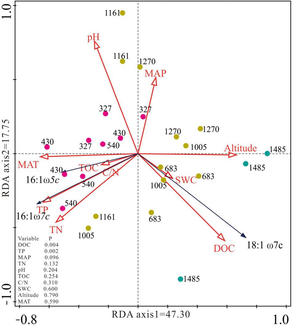 Redundancy analysis (RDA) ordination plot of the concentration of 16:1ω7c, 16:1ω5c, and 18:1ω7c constrained by the altitude, climate, and soil environmental factors. MAT, mean annual temperature; MAP, mean annual precipitation; TOC, soil total organic carbon; DOC, dissolved organic carbon; TN, total nitrogen; TP, total phosphorus; C/N, carbon and nitrogen ratio.