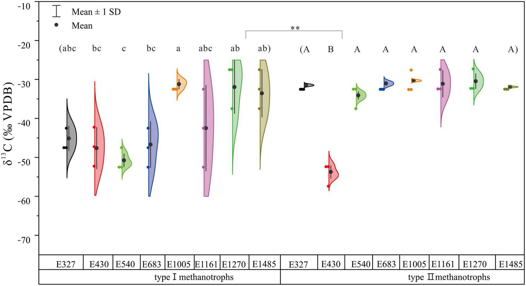 The δ13C values of type I and type II methanotroph biomarkers based on phospholipid fatty acids along the altitude gradient on the northern slope of the Changbai Mountain, China. Different letters indicate significant differences among study sites based on one-way ANOVA and Tukey’s test (p < 0.05). The asterisk represents the difference between type I and type II methanotrophs (**p < 0.01). The δ13C values of type I methanotroph biomarkers were the average δ13C values of 16:1ω7c and 16:1ω5c.