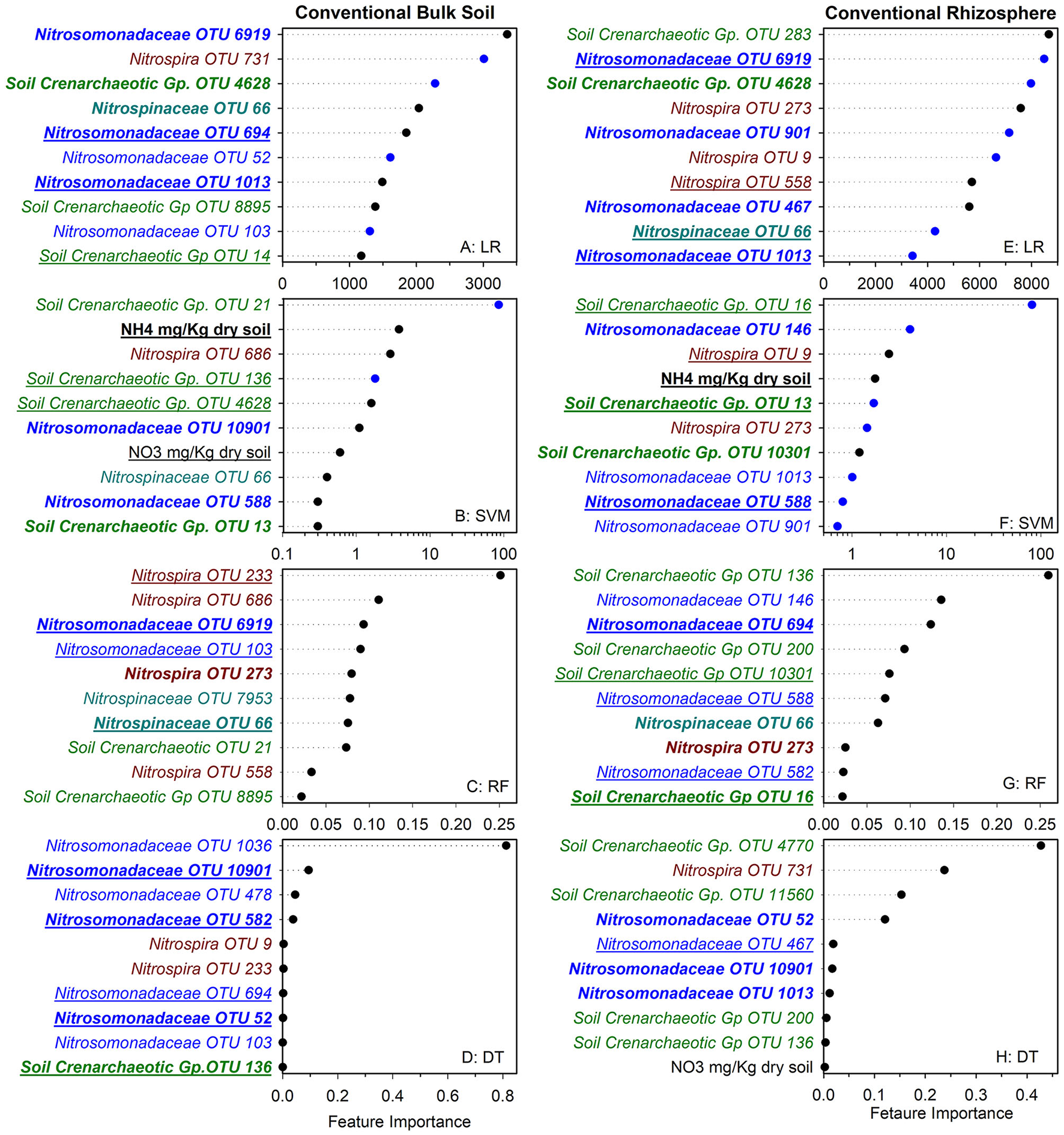 Figure 1. Ranks of absolute feature weights of linear (A,B,E,F) and nonlinear (C,D,G,H) models for conventional bulk soil and rhizosphere. The 10 highest ranked features in absolute feature weights are displayed from highest to lowest. In regression (A,E) and SVM (B,F), the features and importance of OTUs that were positively associated with nitrification are represented by black dots, and those negatively associated with nitrification are shown in blue. The values for linear regression are the absolute feature importance, while for SVM, the log10 relative absolute feature importance. Within each model, bold OTUs indicate the same OTUs in bulk soil and rhizosphere within a cropping system, and underlined features indicate the same OTUs in bulk soil or rhizosphere between cropping systems. Random Forest (C,G). Decision Tree (D,H).