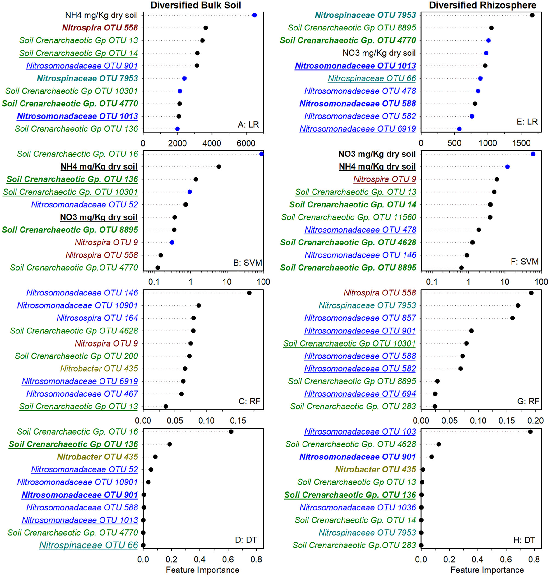 Figure 2. Ranks of absolute feature weights of linear (A,B,E,F) and nonlinear (C,D,G,H) models for diversified bulk soil and rhizosphere. The 10 highest ranked features of absolute feature weights are displayed from highest to lowest. In regression (A,E) and SVM (B,F), feature importance of OTUs positively associated with nitrification are represented by black dots, and those negatively associated with nitrification are shown in blue. Values for linear regression are the absolute feature importance, while for SVM, the log10 relative absolute feature importance. Within each model, bold OTUs indicate the same OTUs in bulk soil and rhizosphere within a cropping system and underlined features indicate the same OTUs in bulk soil or rhizosphere between cropping systems. Random Forest (C,G). Decision Tree (D,H).