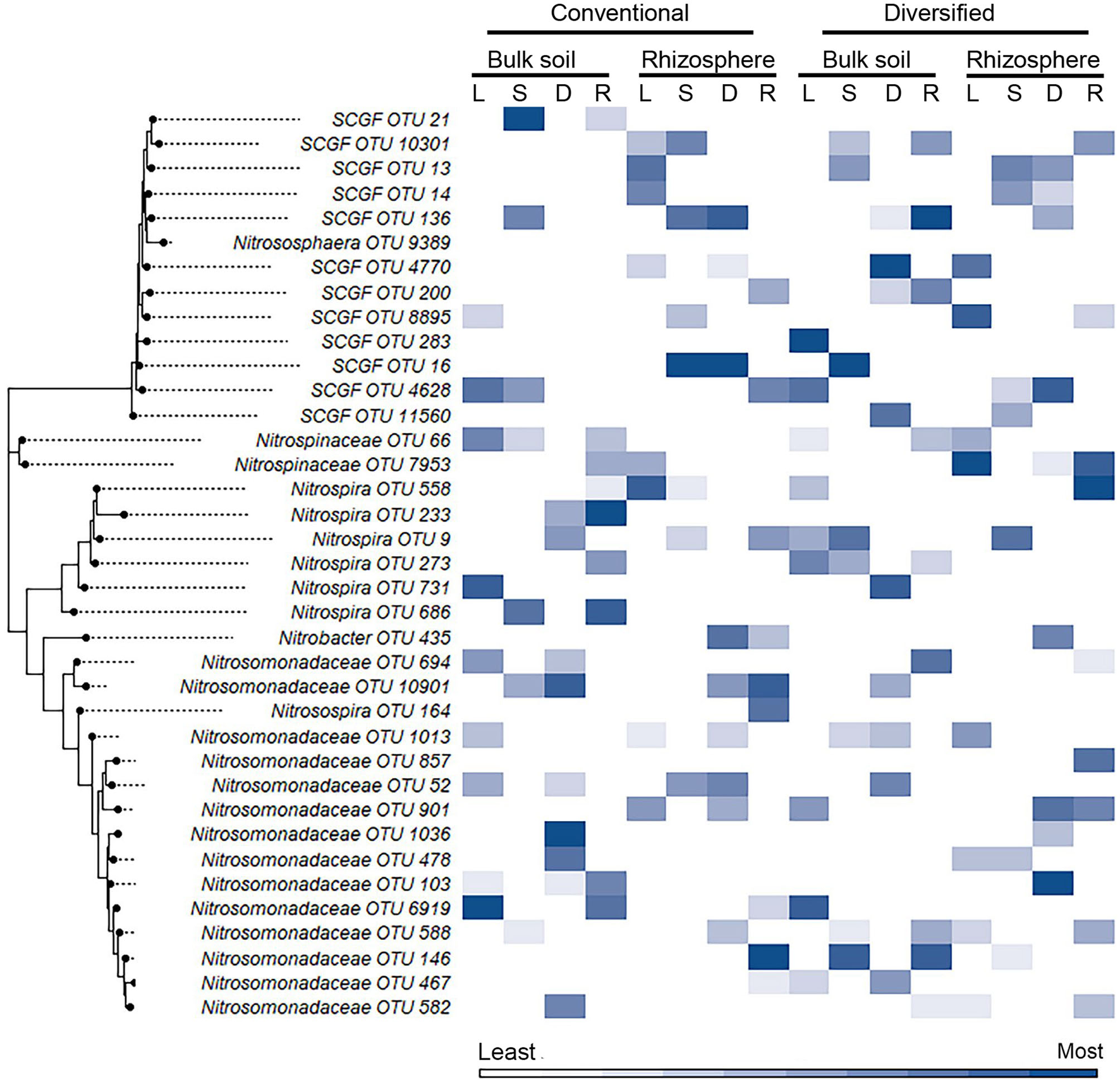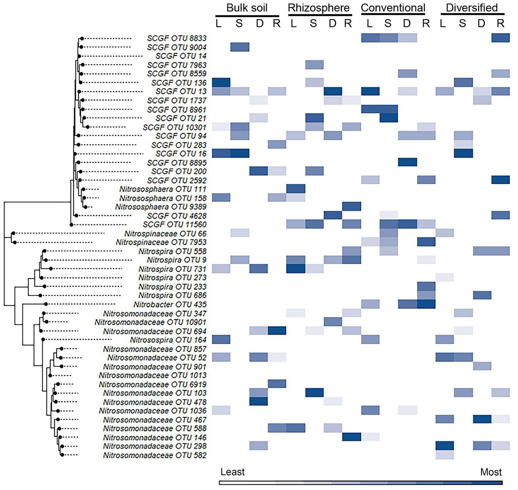 Figure 3. Heat map of importance of specific OTU's in linear and nonlinear models for each cropping system by habitat. OTU 16S V4 sequences were aligned using ClustalW in MEGA11, and the trees were generated using the maximum likelihood method with default parameters. Heat map color (within a column) reflects importance of the top 10 OTUs: white reflects OTUs ranked 10th or below in model importance (linear regression: L; support vector machine: S; decision tree: D; random forest: R). SCGF, soil crenarchaeotic group family.