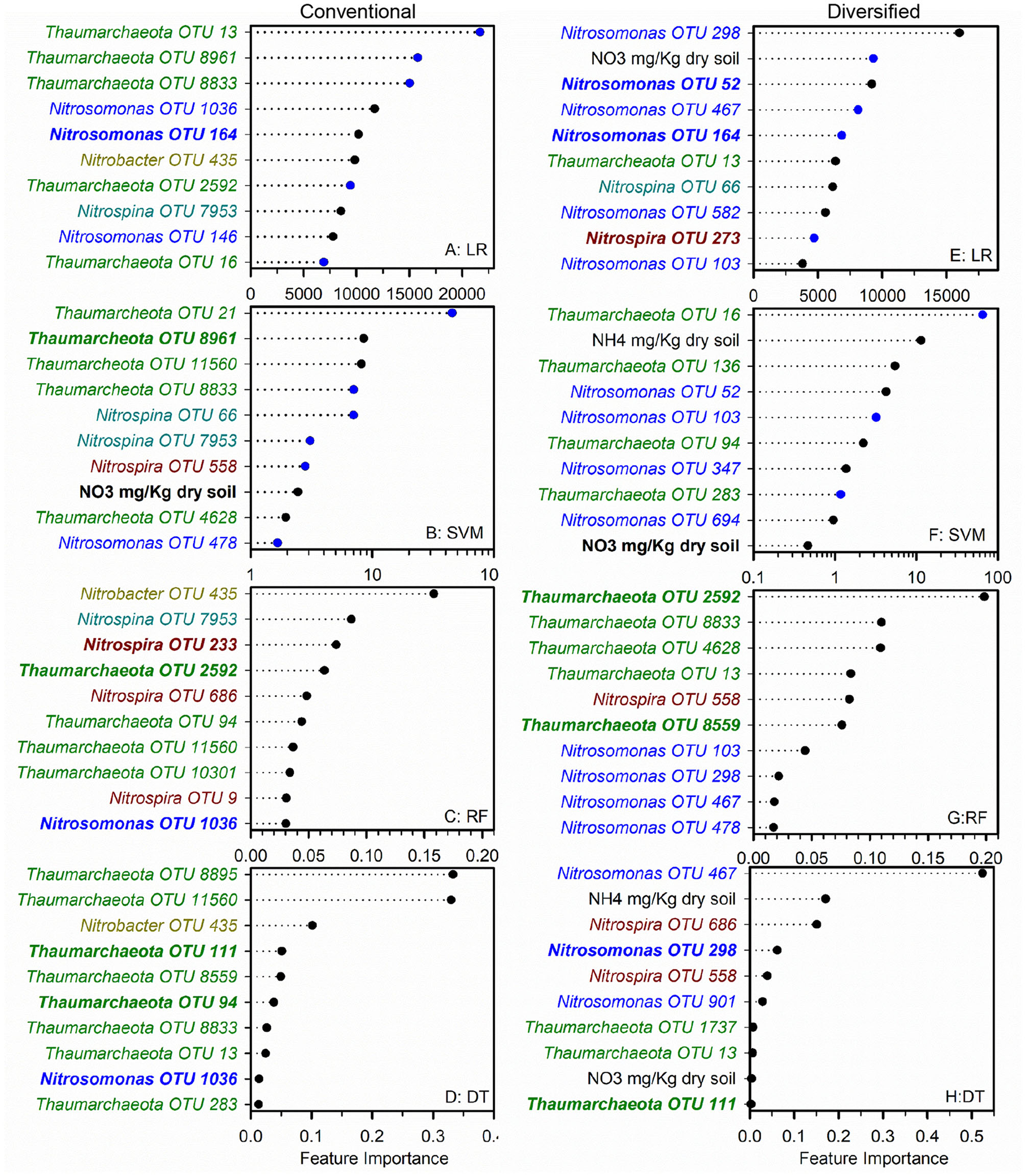 Figure 5. Ranks of absolute feature weights of linear (A,B,E,F) and nonlinear (C,D,G,H) models for each cropping system. The 10 highest ranked features of absolute feature weights are displayed from highest to lowest. In regression (A,E) and SVM (B,F), feature importance of OTUs positively associated with nitrification are represented by black dots, and those negatively associated with nitrification are shown in blue. The values for linear regression are the absolute feature importance, while for SVM, the log10 relative absolute feature importance. Within each model, bold OTUs indicate the same OTUs in both cropping systems. Random Forest (C,G). Decision Tree (D,H).