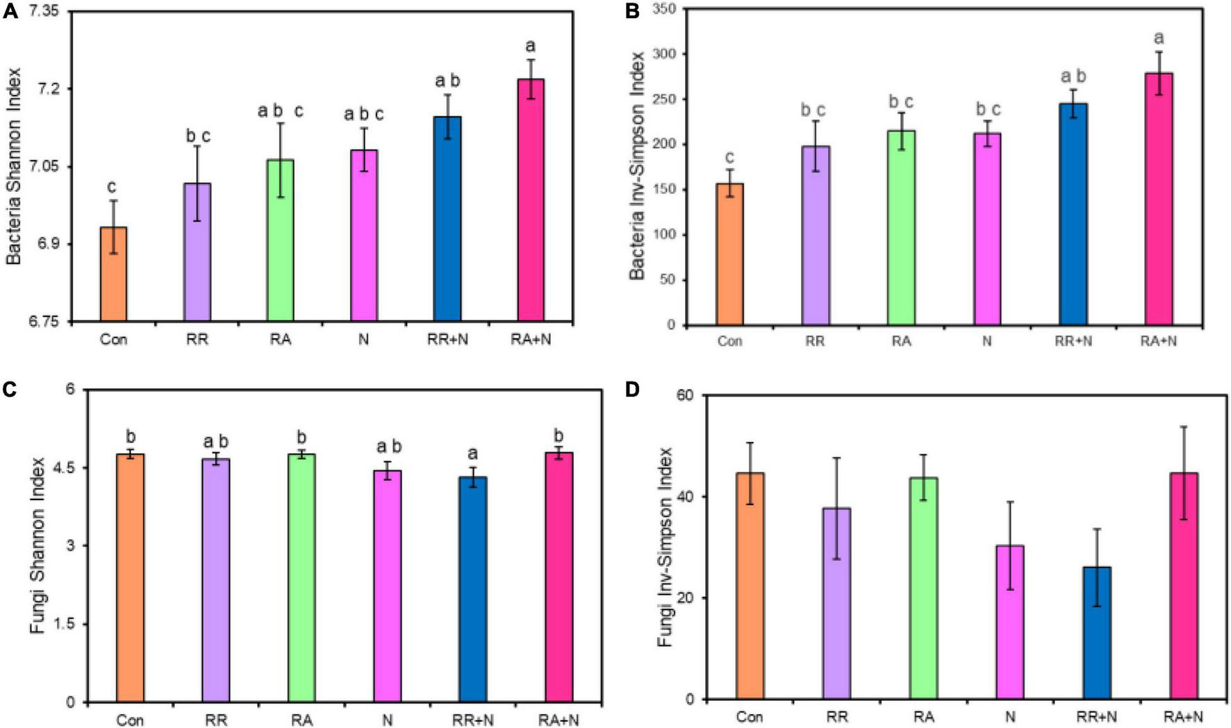 The effects of altered nitrogen addition and rainfall, and their interaction, on bacterial Shannon index (A) and Inv-Simpson index (B), fungal Shannon index (C) and Inv-Simpson index (D) in August 2018. Different treatments: Con: Control; RR: Rainfall reduction; RA: Rainfall addition; N: Nitrogen addition; RR + N: Rainfall reduction and Nitrogen addition; RA + N: Rainfall addition and Nitrogen addition. Values are mean ± SE (n = 5). Different lowercase letters indicate significant differences (p < 0.05) according to Duncan’s post hoc test.
