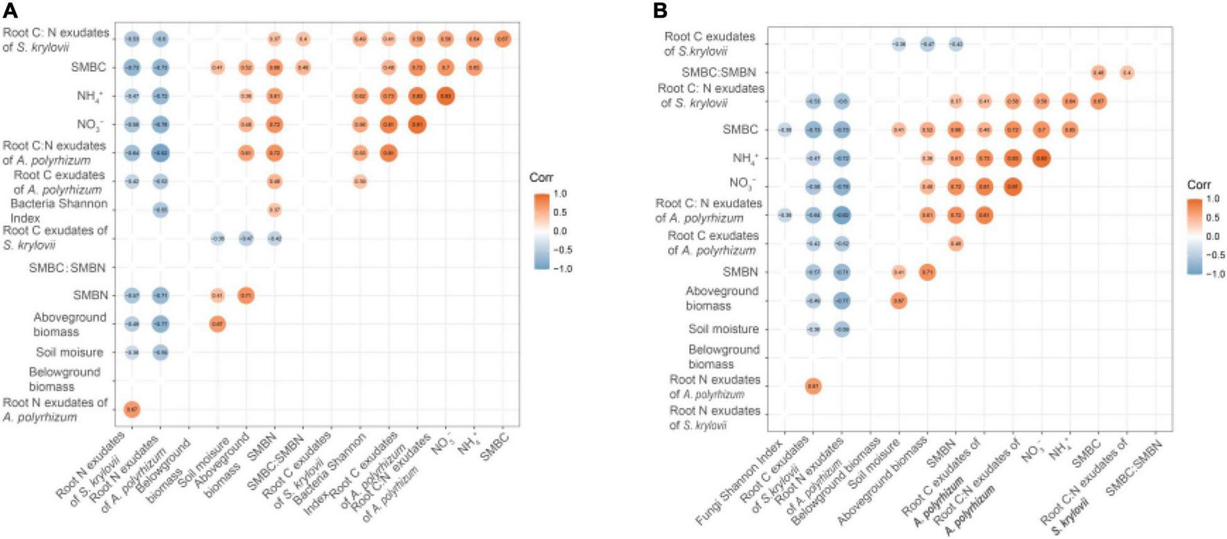 Pearson correlations among bacterial Shannon index (A), fungi Shannon index (B), aboveground biomass, belowground biomass, soil moisture, soil microbial biomass carbon (SMBC), soil microbial biomass nitrogen (SMBN), SMBC:SMBN, NO3–, NH4+, root C exudates of Stipa krylovii, root N exudates of S. krylovii, root C: N exudates of S. krylovii, root C exudates of Allium polyrhizum, root N exudates of A. polyrhizum, and root C: N exudates of A. polyrhizum. The number represents the correlation coefficient. Coefficients that are not correlated have been hidden. Different treatments: Con: Control; RR: Rainfall reduction; RA: Rainfall addition; N: Nitrogen addition; RR + N: Rainfall reduction and Nitrogen addition; RA + N: Rainfall addition and Nitrogen addition.