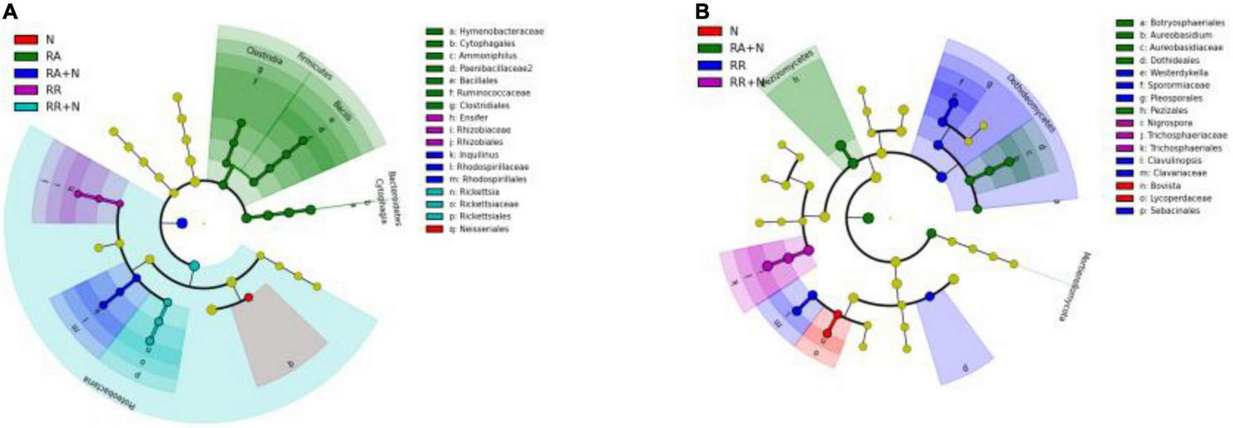 At the phylum level, the bacterial community was dominated by Actinobacteria (mean⋅20%), Acidobacteria (mean 16%), and Proteobacteria (mean 13%) (Figure 3A). The fungal community was mainly constituted of Ascomycota (mean 78%), Basidiomycota (mean 10%), and Glomeromycota (mean 0.70%) (Figure 3B). LefSe showed that the bacterial biomarkers of RR mainly belonged to the phylum Proteobacteria (genus Ensifer, family Rhizobiaceae). The biomarkers of RA included the phyla Gemmatimonadetes (class Longimicrobia), Firmicutes (class Clostridia and order Bacillales), Bacteroidetes (order Cytophagales), and class Deltaproteobacteria. The biomarkers of N addition mainly belonged to the phylum Proteobacteria (order Neisseriales). The biomarker bacteria of RR + N mainly belonged to the phylum Proteobacteria, while the biomarkers of RA + N belonged to the phylum Proteobacteria (genus Inquilinus, family Rhodospirillaceae, and order Rhodospirillales) (LDA = 2, Figure 4A). The biomarker fungi of RR mainly belonged to the phyla Ascomycota (class Dothideomycetes) and Basidiomycota (genus Clavulinopsis, family Clavariaceae, and order Sebacinales). The fungal biomarkers of N treatment mainly belonged to the phylum Basidiomycota (genus Bovista and family Lycoperdaceae). The indicator fungi of RR + N treatment mainly belonged to the phylum Ascomycota (genus Nigrospora, family Trichosphaeriaceae, and order Trichosphaeriales). The indicator fungi of RA + N treatment belonged to the phylum Ascomycota (class Pezizomycetes, order Botryosphaeriales, genus Aureobasidium, family Aureobasidiaceae, and order Dothideales) (LDA = 4, Figure 4B).