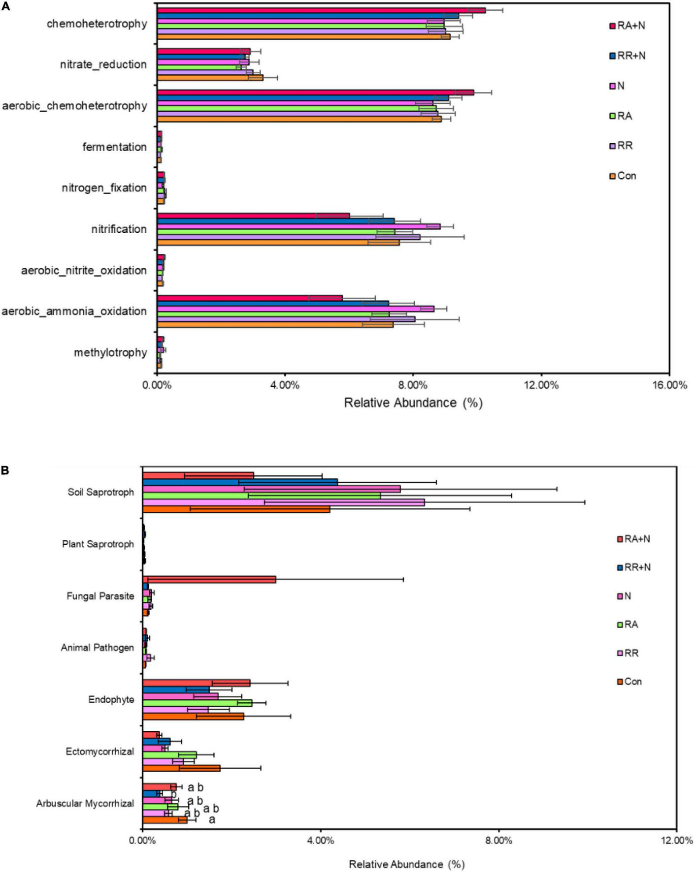 The effects of altered nitrogen addition and rainfall, and their interaction, on the relative abundance of bacterial (A) and fungal (B) functional groups based on the FAPROTAX tool and FUNGuild pipeline, respectively. Different treatments: Con: Control; RR: Rainfall reduction; RA: Rainfall addition; N: Nitrogen addition; RR + N: Rainfall reduction and Nitrogen addition; RA + N: Rainfall addition and Nitrogen addition. Values are mean ± SE (n = 5). Different lowercase letters indicate the significant differences (p < 0.05) according to Duncan’s post hoc test. Different lowercase letters indicate significant differences (p < 0.05) according to Duncan’s post hoc test.