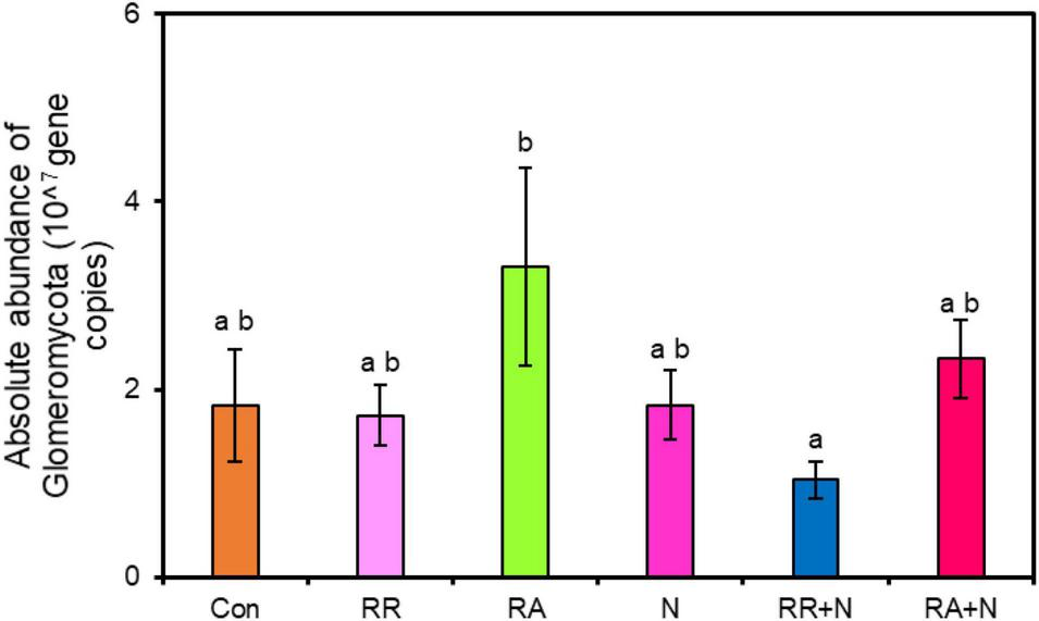 The effects of nitrogen addition and rainfall and their interaction on the absolute abundance of Glomeromycota. Different treatments: Con: Control; RR: Rainfall reduction; RA: Rainfall addition; N: Nitrogen addition; RR + N: Rainfall reduction and Nitrogen addition; RA + N: Rainfall addition and Nitrogen addition. Values are mean ± SE (n = 5). Different lowercase letters indicate significant differences (p < 0.05) according to Duncan’s post hoc test.