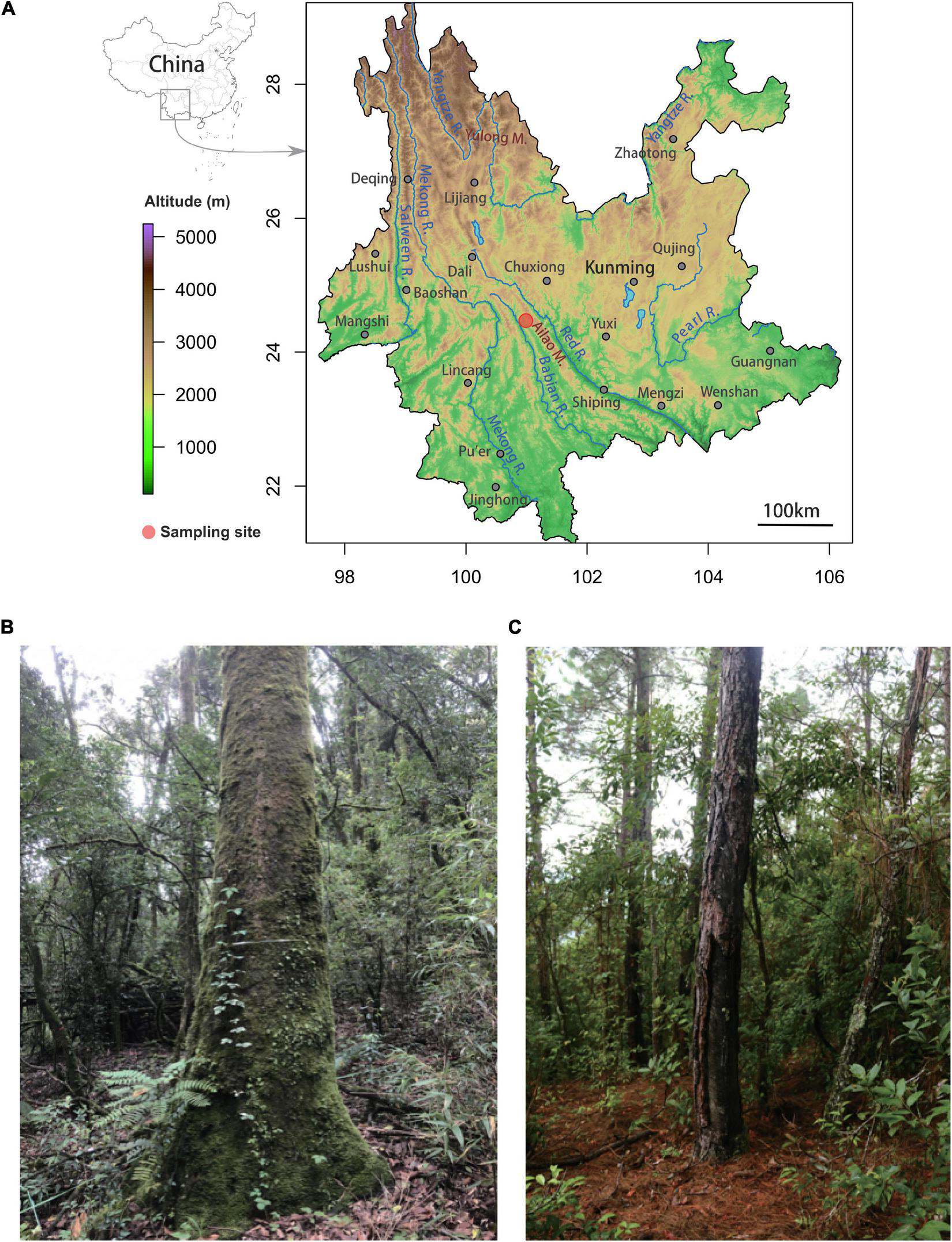 Figure 1. Location of the primary old-growth stone oak (Lithocarpus) forest and the secondary Pinus plantation in the Ailaoshan National Nature Reserve at Xujiaba Region. (A) The upper map shows the location of the reserve (red dot) in Central Yunnan. The photos illustrate the different forest associations where the soil cores were sampled with (B) the native, primary old-growth Lithocarpus forest and (C) the Pinus yunnanensis plantation.