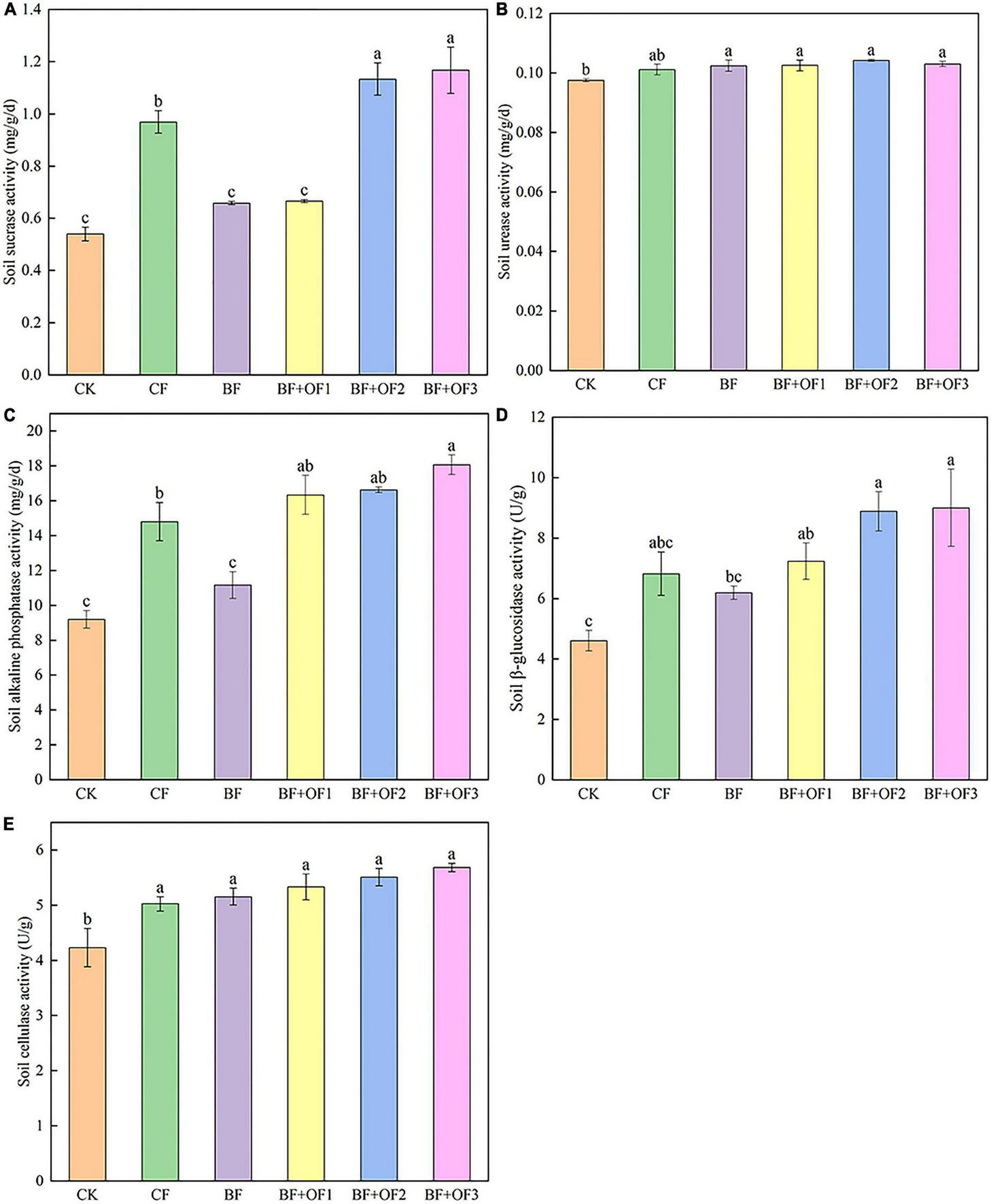 Soil enzyme activities under different fertilization treatments. The sucrase activities (A), urease activities (B), alkaline phosphatase activities (C), β-glucosidase activities (D) and cellulase activity (E). CK, no fertilizer, CF, chemical fertilizers (conventional dosage for this region); BF, balanced fertilizer (70% of total chemical fertilizer); BF + OF1, BF + OF2, and BF + OF3, balanced fertilizer plus 3,000, 6,000, and 12,000 kg⋅ha–1 bio-organic fertilizer, respectively. Each histogram represents the mean ± standard error (SE) of three independent biological experiments (n = 3). Different letters above the bars indicate statistically significant differences by Duncan’s test (p < 0.05).