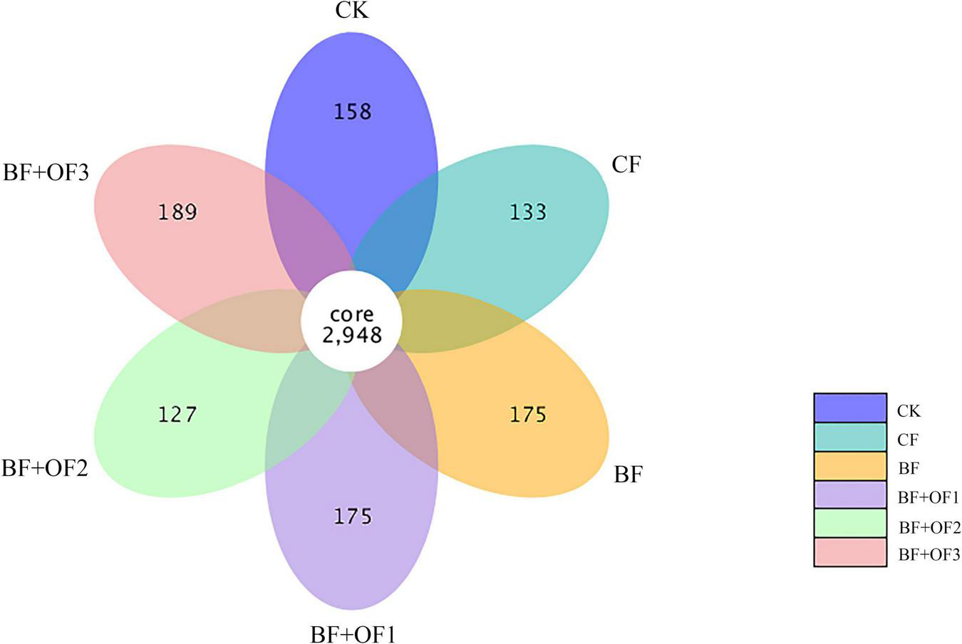 Petal plot of soils with different fertilization treatments based on operational taxonomic unit (OTU) distribution. CK, no fertilizer, CF, chemical fertilizers (conventional dosage for this region); BF, balanced fertilizer (70% of total chemical fertilizer); BF + OF1, BF + OF2, and BF + OF3, balanced fertilizer plus 3,000, 6,000, 12,000 kg.ha–1 bio-organic fertilizer, respectively.