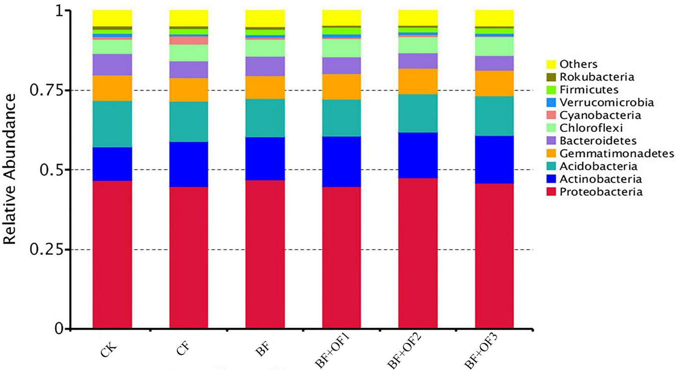 Relative abundances of species at phylum level under different fertilization treatments. CK, no fertilizer, CF, chemical fertilizers (conventional dosage for this region); BF, balanced fertilizer (70% of total chemical fertilizer); BF + OF1, BF + OF2, and BF + OF3, balanced fertilizer plus 3,000, 6,000, 12,000 kg.ha–1 bio-organic fertilizer, respectively.