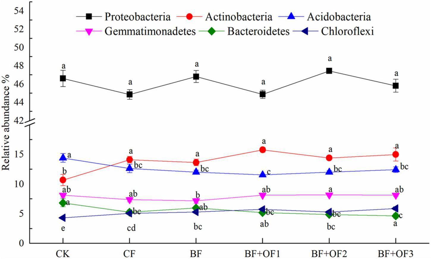 Relative abundances of six dominant bacteria at the phylum level under different fertilization treatments. CK, no fertilizer; CF, chemical fertilizers (conventional dosage for this region); BF, balanced fertilizer (70% of total chemical fertilizer); BF + OF1, BF + OF2, and BF + OF3, balanced fertilizer plus 3,000, 6,000, and 12,000 kg.ha–1 bio-organic fertilizer, respectively. Different letters above the bars indicate statistically significant differences by Duncan’s test (p < 0.05).