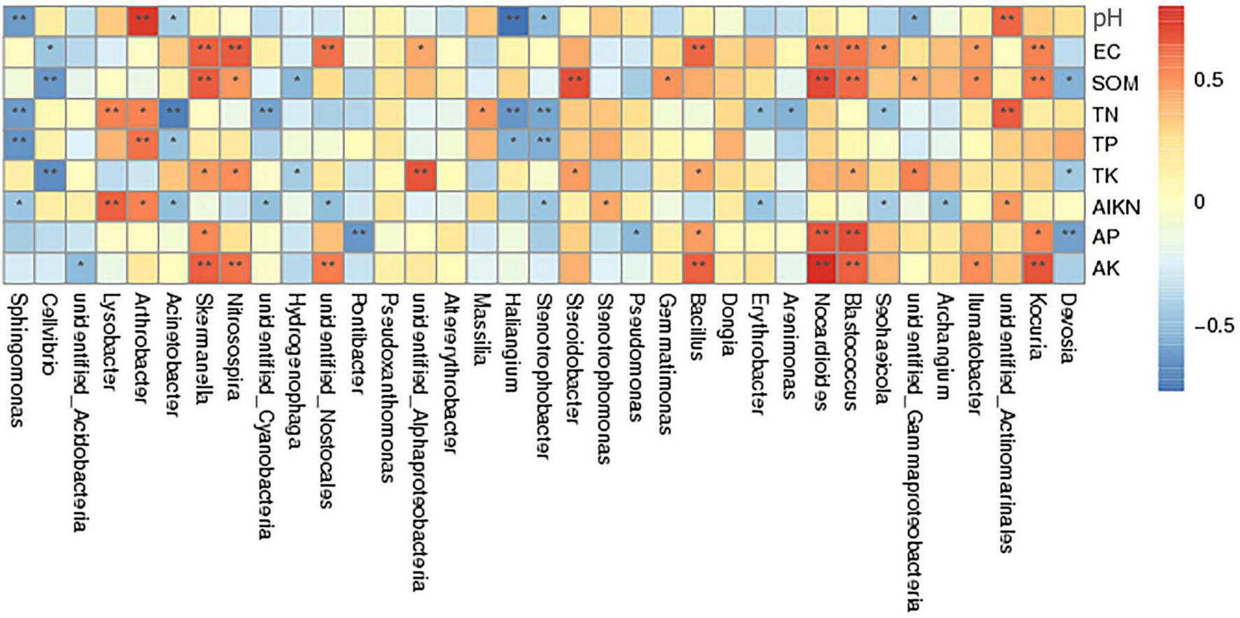 The pH of the soil samples was measured using a pH electrode (PHS-3C, Shanghai Yidian Scientific Instrument Co., Ltd., Shanghai, China) at a soil/water ratio of 1:5. The electrical conductivity (EC) of the soil samples was measured using a conductivity meter (DDS-307A, Shanghai Yidian Scientific Instrument Co., Ltd., Shanghai, China) at a soil/water ratio of 1:5. The potassium dichromate volumetric method was used to measure the SOM content. The TN, total phosphorus (TP), and total potassium (TK) contents were measured after the digestion with H2SO4-H2O2 mixture. TN content was analyzed using a Kjeldahl nitrogen analyzer, TP content was measured using the Mo-Sb colorimetric method, and TK content was determined using flame spectrometry. Alkali-hydrolyzed nitrogen (Alk N), AP, and AK contents were analyzed using diffusion, Olsen, and ammonium acetate extraction flame photometry methods, respectively. These methods were modified according to Lu (1999). Soil enzyme (sucrase, urease, and alkaline phosphatase) activity was estimated by colorimetry (Guan et al., 1986). The soil enzyme activities of β-glucosidase and cellulase were measured using a soil β-glucosidase (S-β-GC) activity assay kit (BC0165) and soil cellulase (S-CL) activity assay kit (BC0155, Solarbio Biotech Co., Ltd., Beijing, China), respectively. To guarantee the validity of the experimental data, three independent tests were performed on each sample.