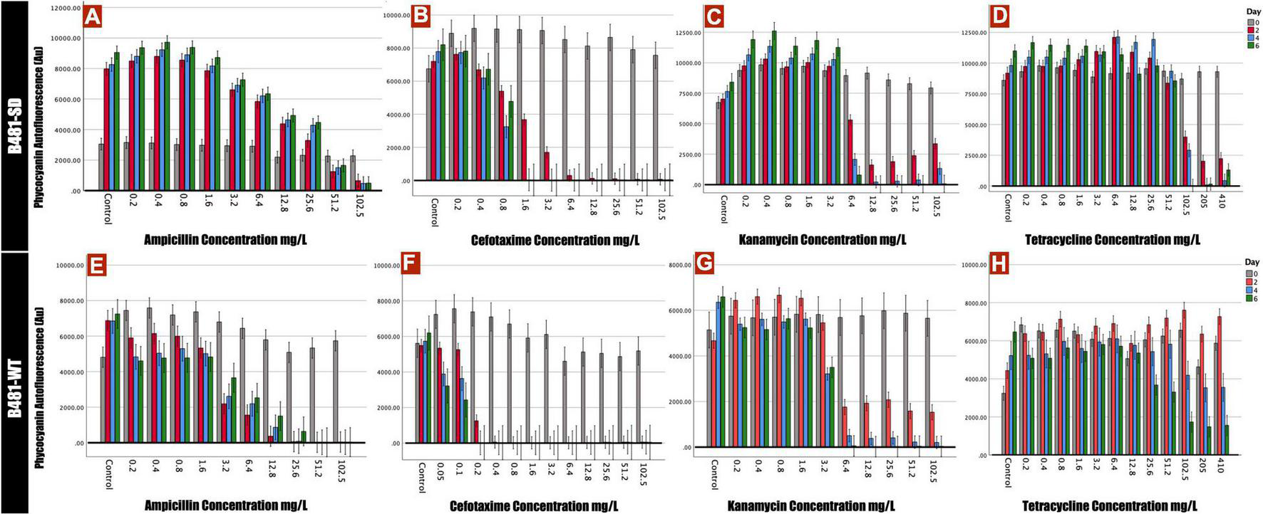 Figure 1. Phycocyanin autofluorescense of B481-SD and B481-WT strains reflected by 590 nm excitation and 650 nm emission. B481-SD strain was exposed to concentrations ranging from 0.2 to 102.5 mg/L ampicillin, cefotaxime, kanamycin, and tetracycline (A–D), and B481-WT strain to ampicillin and kanamycin concentrations ranging from 0.2 to 102.5 mg/L; 0.05–102.5 mg/L for cefotaxime and 0.2–410 mg/L for tetracycline (E–H). Both strains were cultivated in antibiotics for 6 days at 28°C with a light intensity of 30 μmol m– 2 s–1. Mean and standard deviations are indicated by error bars.