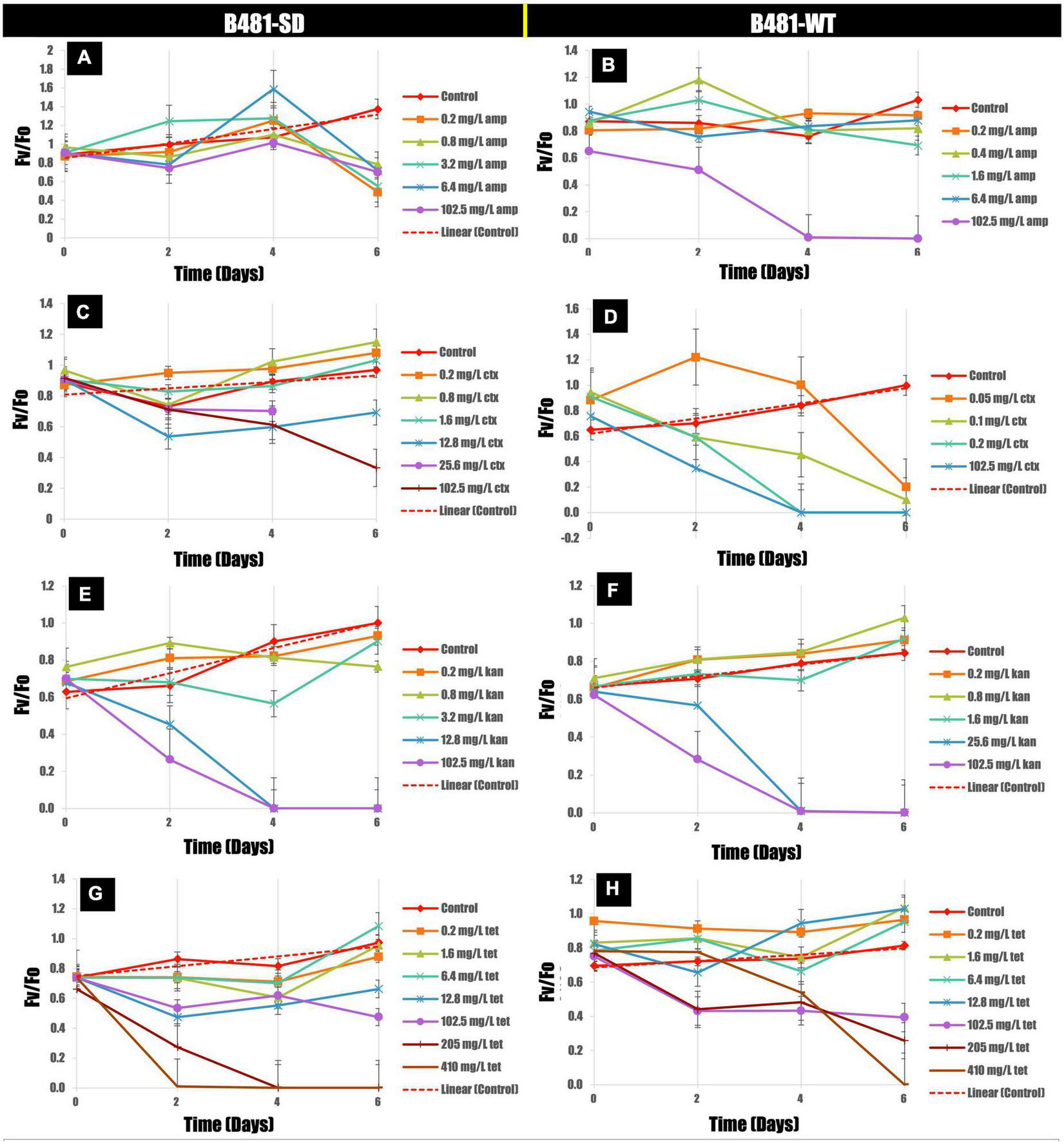 Figure 3. Variance of Fv/Fo in B481-SD (A,C,E,G) and B481-WT (B,D,F,H) strains of Fremyella diplosiphon in response to ampicillin, cefotaxime, kanamycin, and tetracycline exposure for 6 days. Mean and standard deviations are indicated by error bars.