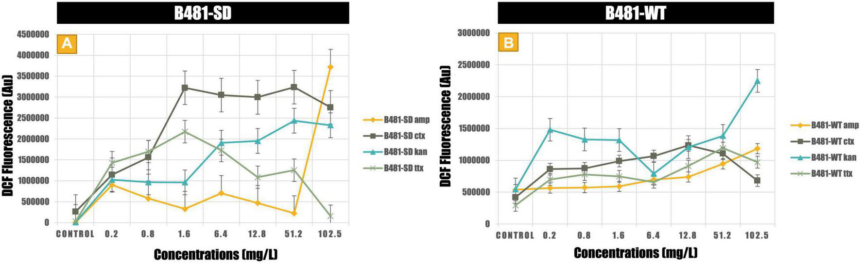 Antibiotic-induced ROS measured using the dichlorodihydrofluorescein revealed significantly higher levels (p < 0.01) in both strains treated with cefotaxime, kanamycin, and tetracycline from 0.2 to 102.5 mg/L compared to the untreated control (Figures 4A,B). While B481-SD treated with 102.5 mg/L ampicillin exhibited significantly higher ROS (p < 0.01), it ranged from 6.4 to 102.5 mg/L for B481-WT (Figures 4A,B). Highest levels of oxidative stress were observed at 51.2 and 102.5 mg/L kanamycin for B481-SD and 102.5 mg/L for B-481-WT.