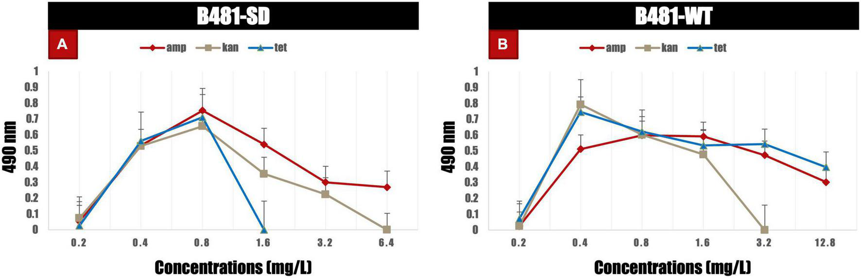 Figure 5. Lactate dehydrogenase activity in B481-SD and B481-WT strains of Fremyella diplosiphon exposed to varying concentrations of ampicillin, kanamycin, and tetracycline (A,B) on day 6. Mean and standard deviations are indicated by error bars.