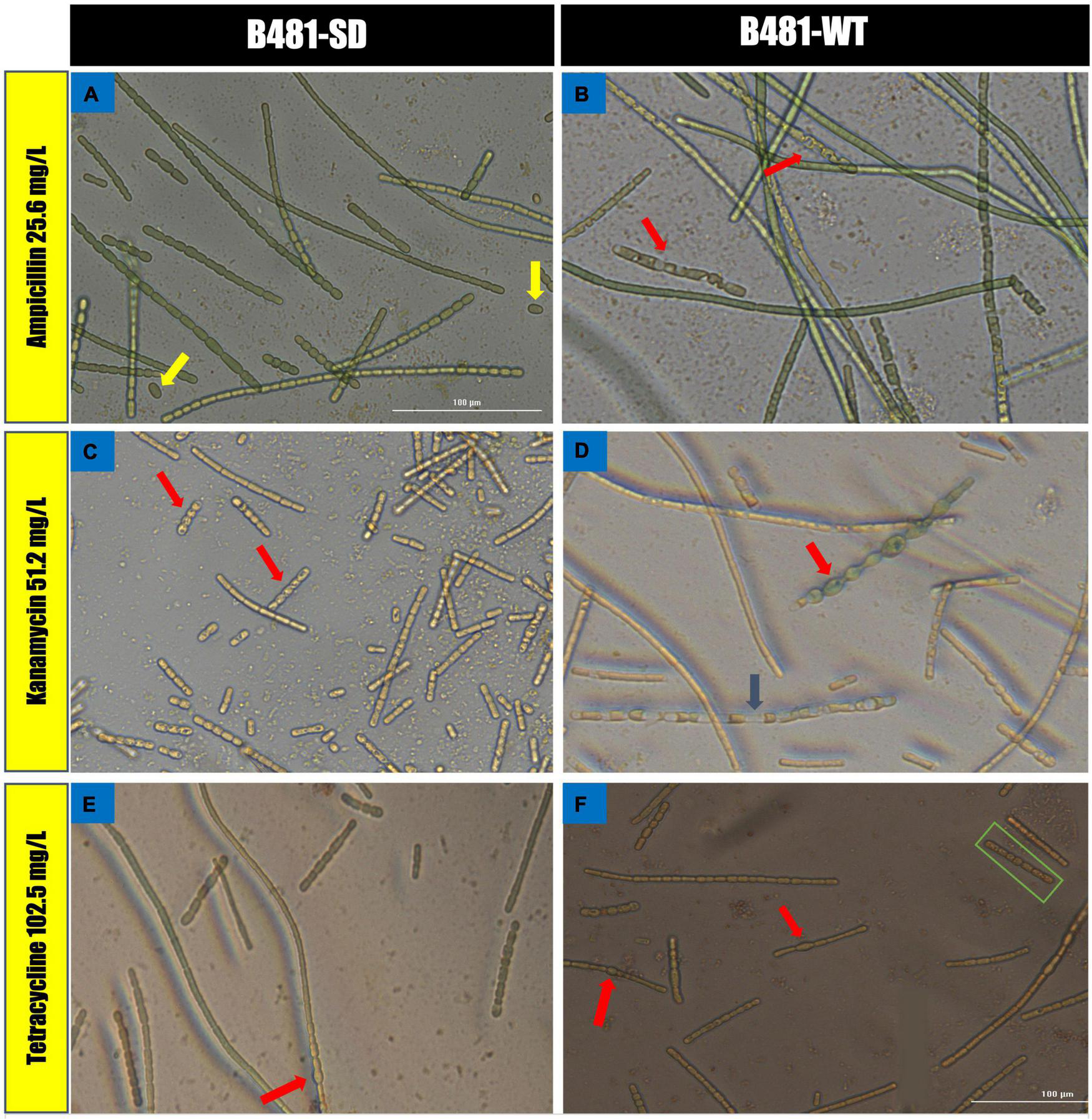 B481-SD and B481-WT strains treated with ampicillin, tetracycline, and kanamycin exhibited maximum LDH activity at the concentrations of 0.8 and 0.4 mg/L. Specifically, enhanced LDH activity (p < 0.05) was observed in B481-SD treated with tetracycline, ampicillin, and kanamycin from 0.2 to 0.8 mg/L (Figure 5A). The LDH activity of B481-WT was higher in kanamycin and tetracycline at 0.4 mg/L compared to ampicillin at the same concentration (Figure 5B). Microscopic observations such as filament fragmentation and alteration of cell shape were observed at concentrations higher than 25.6 mg/L ampicillin for B481-WT and 51.2 mg/L kanamycin for B481-SD and B481-WT (Figures 6B–D). In addition, cellular stress-related structures such as pyrophosphate granules (Figure 6F, green rectangle), akinetes (Figure 6A, yellow arrows), and cellular vacuoles (Figures 6B–F, red arrows) were observed in the strains exposed to higher antibiotic concentrations.