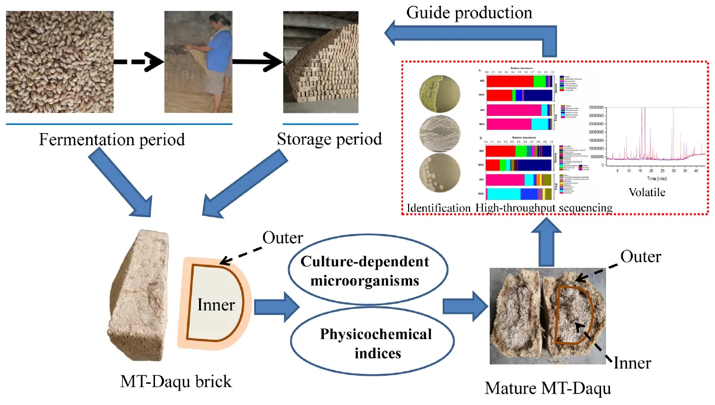 In this study, the bacterial and fungal communities in different parts of strong-flavor Daqu from the fermentation period to the mature period were investigated using a culture-dependent method, and the changes in the physicochemical properties throughout the production process were also explored. Based on these results, the maturity period of MT-Daqu was evaluated, and the analysis of microbial composition, physicochemical indices, and volatile compounds of different parts of mature MT-Daqu using the Illumina MiSeq platform and headspace solid-phase microextraction (HS-SPME)-GC–MS was the main focus. This study provides guidance for the determination of the mature stage, for the process control of MT-Daqu, and for improving the quality of strong-flavor Baijiu.