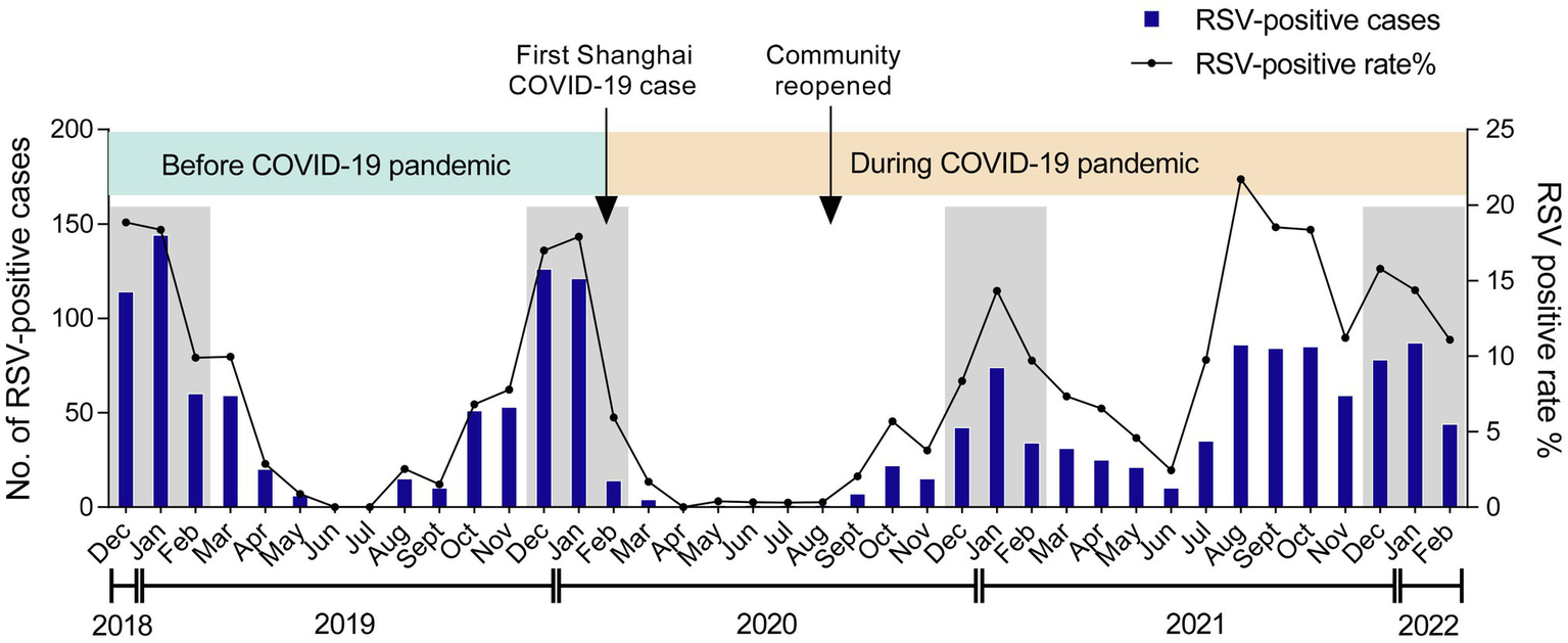 Monthly distribution of RSV among children. The numbers and positive rate of RSV-positive inpatients admitted to the Children’s Hospital of Fudan University from December 2018 to February 2022 were displayed. Arrows labeled the time points when the first COVID-19 case was reported in Shanghai and when the community was reopened. The winter seasons (December–February) are framed by gray rectangles.