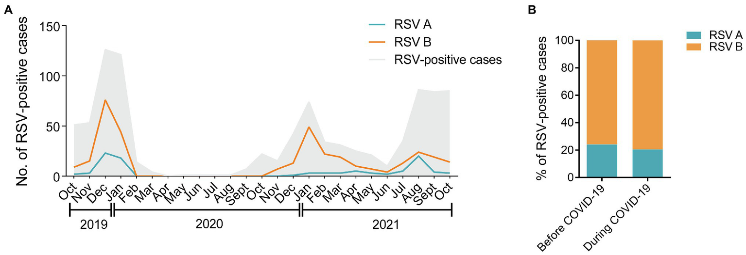 Distribution of RSV A and B subgroups among children before and during COVID-19. (A) The monthly distribution of RSV A and B from October 2019 to October 2021. The gray shadow represents the total number of all the RSV-positive inpatients admitted to the hospital. The blue and orange lines represent the numbers of RSV A- or B-positive inpatients enrolled in the study, respectively. (B) The proportions of RSV A- or B-positive inpatients enrolled in the study before and during COVID-19.