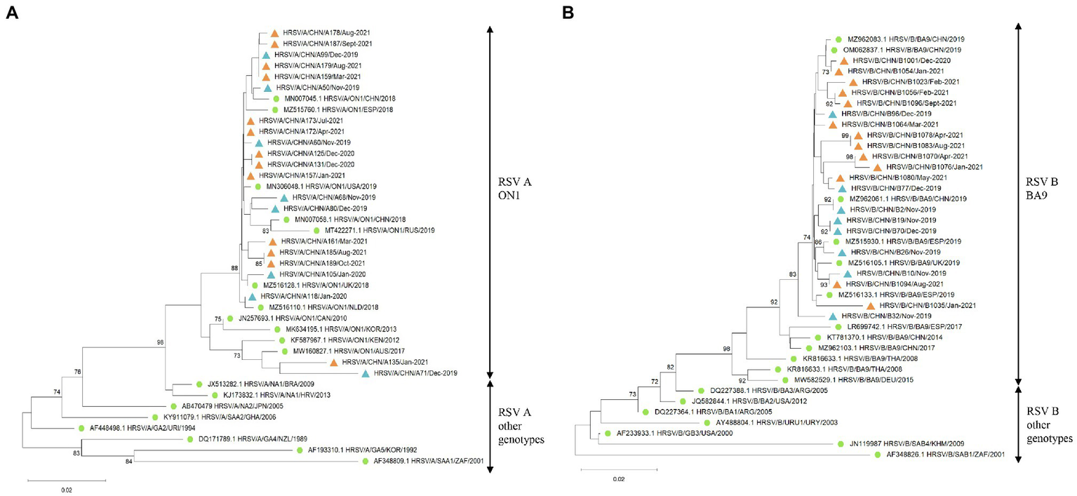 The G gene phylogenetic trees of RSV A and B strains. The phylogenetic trees of RSV A strains (A) and RSV B strains (B) derived in the study during 2019–2021 based on the HVR2 of the G gene. The phylogenetic trees were constructed using neighbor-joining method with 1,000 bootstrap replicates. Bootstrap values > 70% were shown. Reference genotypes downloaded from the GenBank were labeled with green dots. RSV strains derived in the study were labeled with blue triangles before COVID-19 and orange triangles during the pandemic.