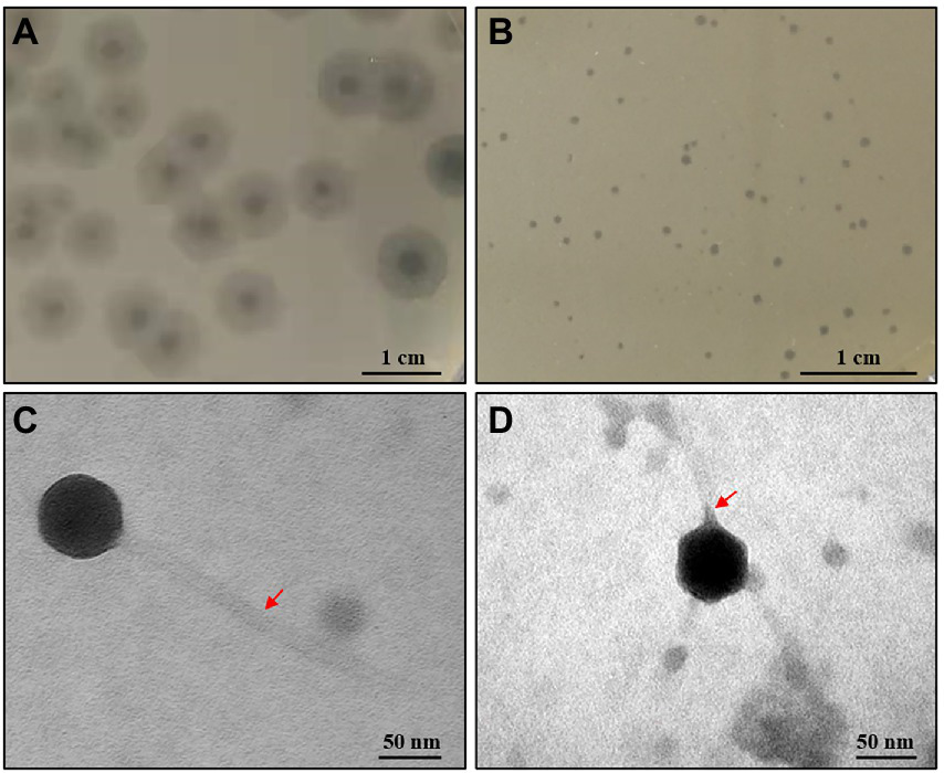 Plaques and ultrastructure observations of phages. (A,B) Plaques formed of phage CM_Kpn_HB132952 and CM_Kpn_HB143742 on the lawn of KPHB132952 and KPHB143742, respectively. (C,D) Morphologies of bacteriophage CM_Kpn_HB132952 and CM_Kpn_HB143742. The red arrow points to the tail of the phage.