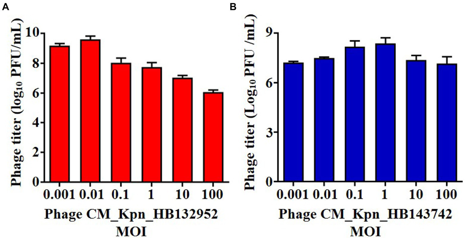 Optimal multiplicity of infection measurements of phages. (A,B) Optimal multiplicity of infection of phage CM_Kpn_HB132952 and CM_Kpn_HB143742, respectively. Data represent Mean ± SD of three biological experiments.