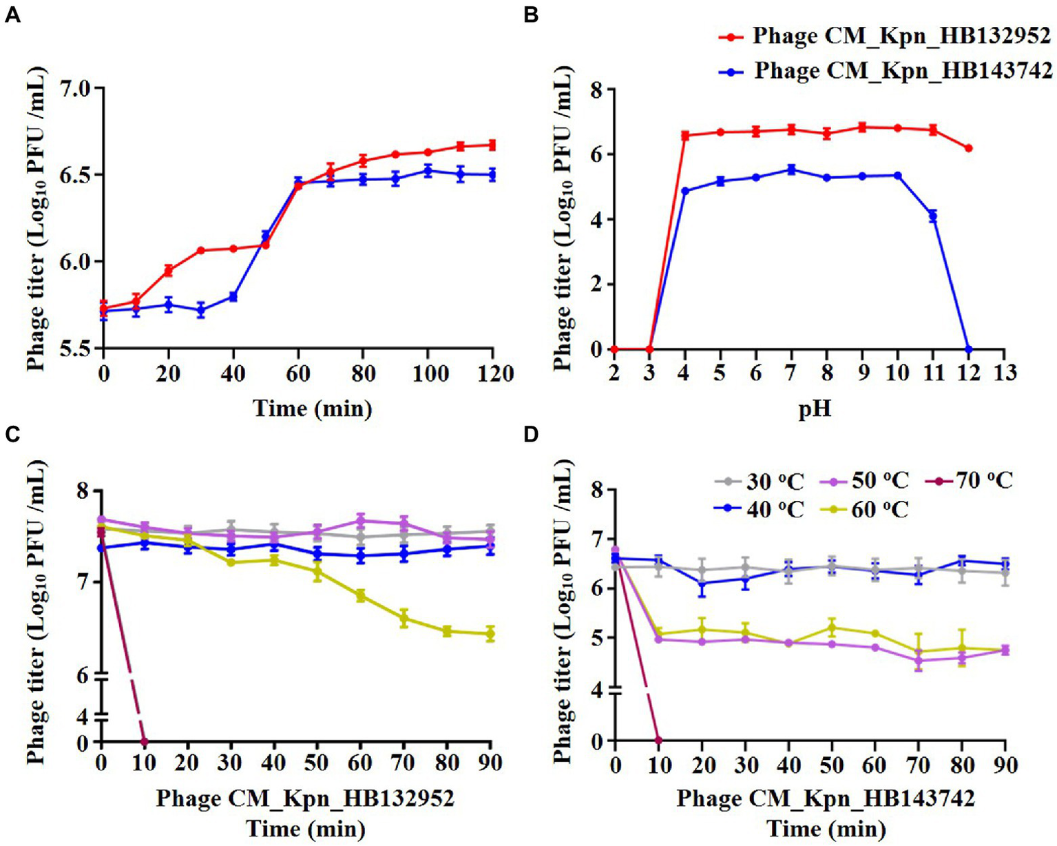 Biological property analyses of phages. (A) One-step growth curve of phage CM_Kpn_HB132952 (red) and CM_Kpn_HB143742. (B) Acid–base stability of phage CM_Kpn_HB132952 (red) and phage CM_Kpn_HB143742 (blue). (C,D) Thermal stability of phage CM_Kpn_HB132952 and phage CM_Kpn_HB143742, respectively. Data represent Mean ± SD of three biological experiments.