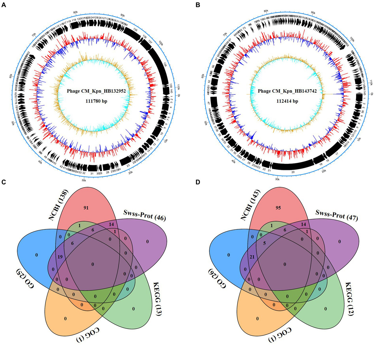 Whole-genome analyses of phages. (A,B) The genome structure of phage CM_Kpn_HB132952 and CM_Kpn_HB143742, respectively. (C,D) Predicted gene annotation numbers in NCBI, Swiss-Prot, GO, COG, and KEGG databases of phage CM_Kpn_HB132952 and CM_Kpn_HB143742, respectively.