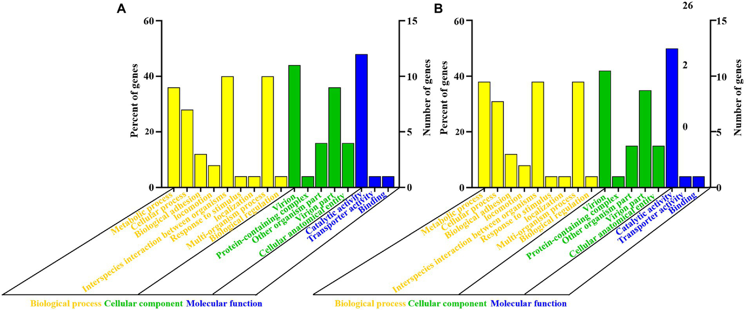 Gene ontology functional annotation of phages. (A,B) Gene ontology (GO) analysis of phage CM_Kpn_HB132952 and CM_Kpn_HB143742, respectively. Based on GO functional annotation, phage CM_Kpn_HB132952 had a total of 25 genes and CM_Kpn_HB143742 had a total of 26 genes.