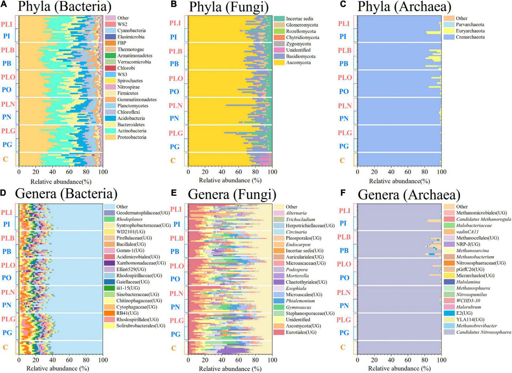 Figure 1. The compositions of soil bacterial (A,D), fungal (B,E), and archaeal (C,F) communities at the phylum (top) and genus (bottom) level. Only dominant genera with the top 20 mean relative abundance were shown. UG, unidentified genus; C, natural grass; P, pika disturbance; PL, grazing and pika disturbance; G, grassland; N, new mound; O, old mound; B, bare land; I, inside the mound.