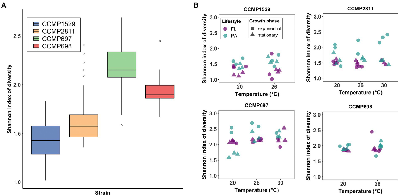 Analysis of Alpha diversity of the bacterial communities of Prorocentrum cordatum measured by mean Shannon diversity index. (A) Total Shannon diversity index of the bacterial communities. All samples were grouped by strain and are indicated by color. The solid black lines indicate medians, and the lower and upper bounds of the box represent the 25% and 75% quartiles. Outliers are indicated as open circles and represent samples falling outside the 10% and 90% quartiles. (B) The Shannon diversity between temperature (x-axis), lifestyles (color) and growth phase (shape) was analyzed for the bacterial communities of each P. cordatum strain.